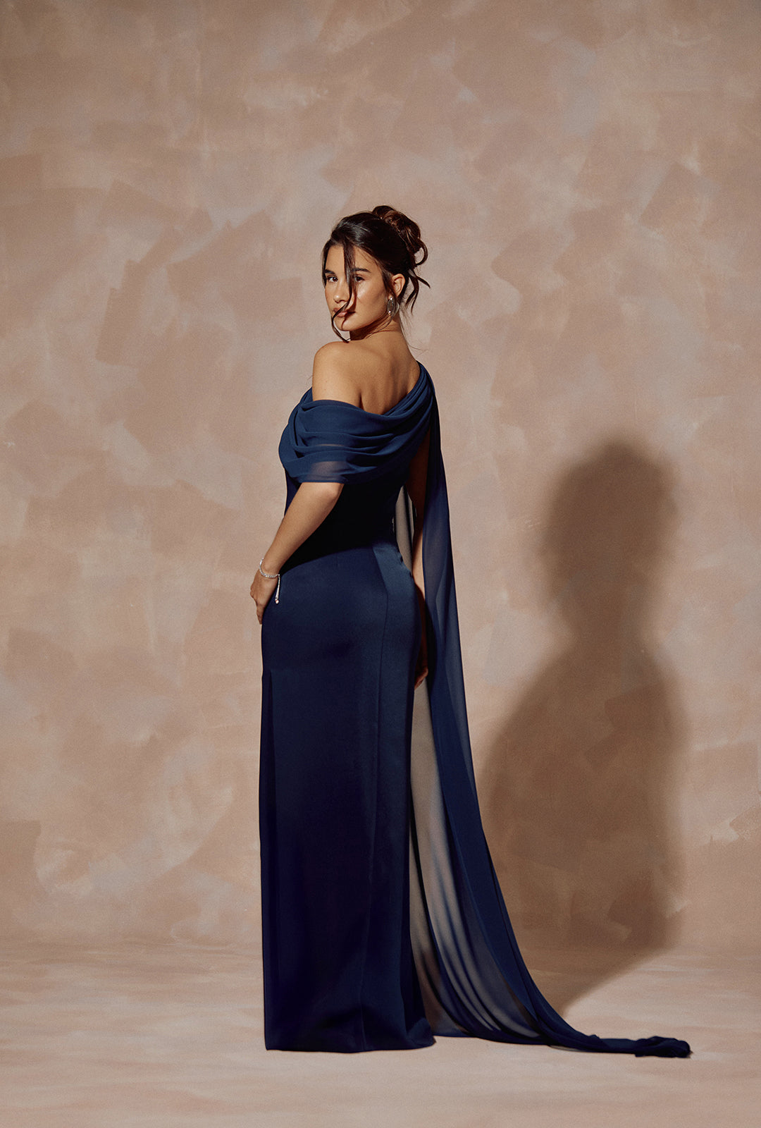 Long Dress with Mikado Bandeau Bodice and Crepe Skirt