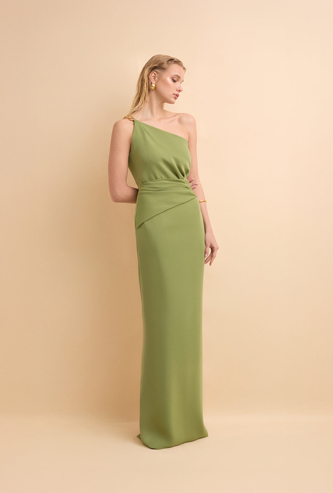 Long Crepe Gown with Draped Waist and One-Shoulder Chain
