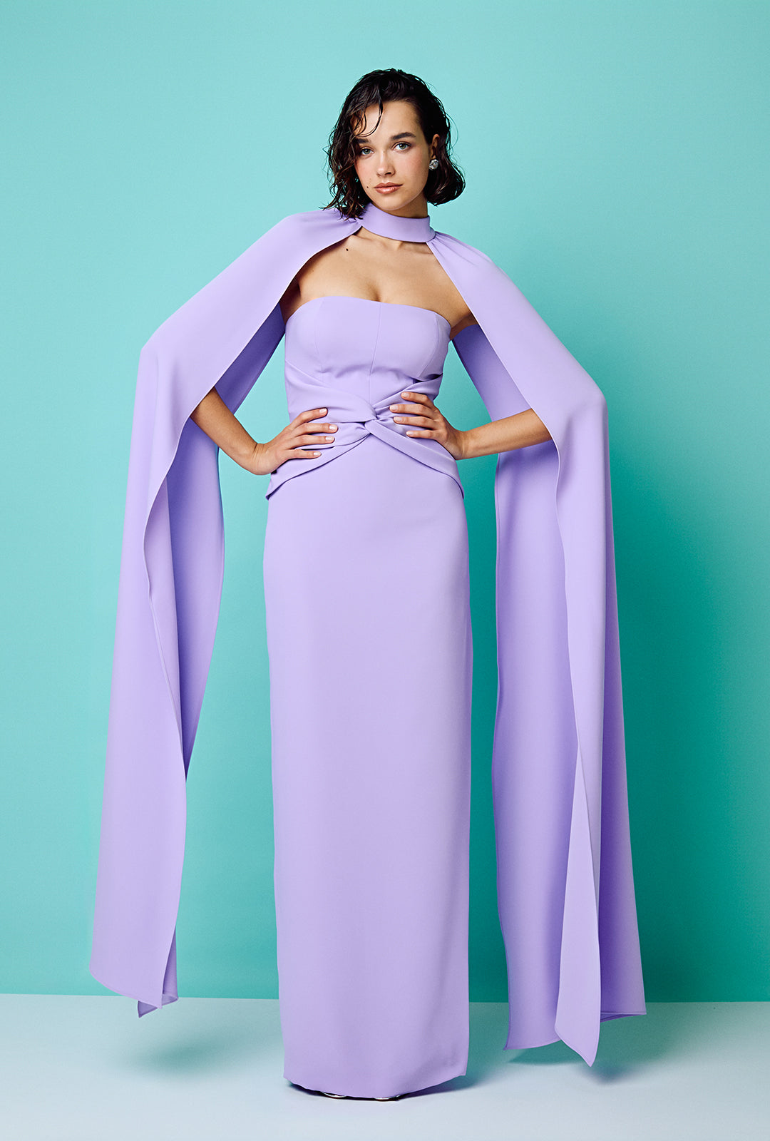 Strapless Crepe Long Dress with Knot Detail and Optional Cape