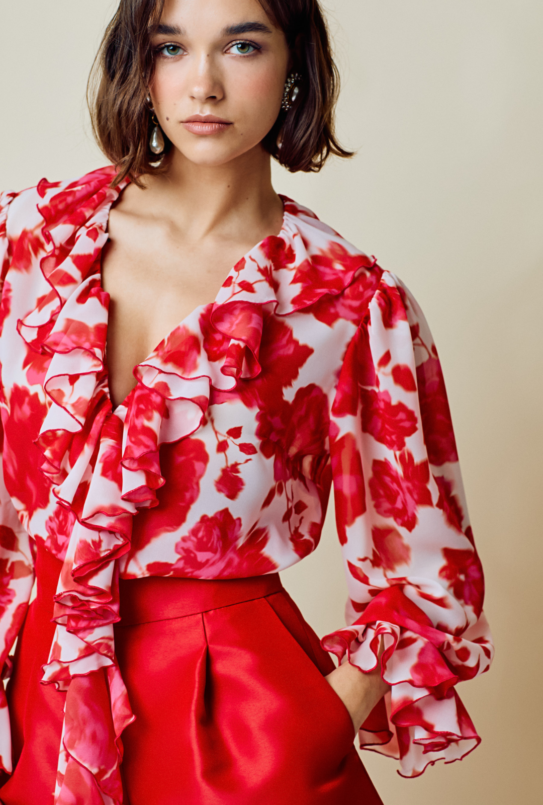 Delicate and feminine, this blouse stands out with a ruffle that traces the V-neckline and...