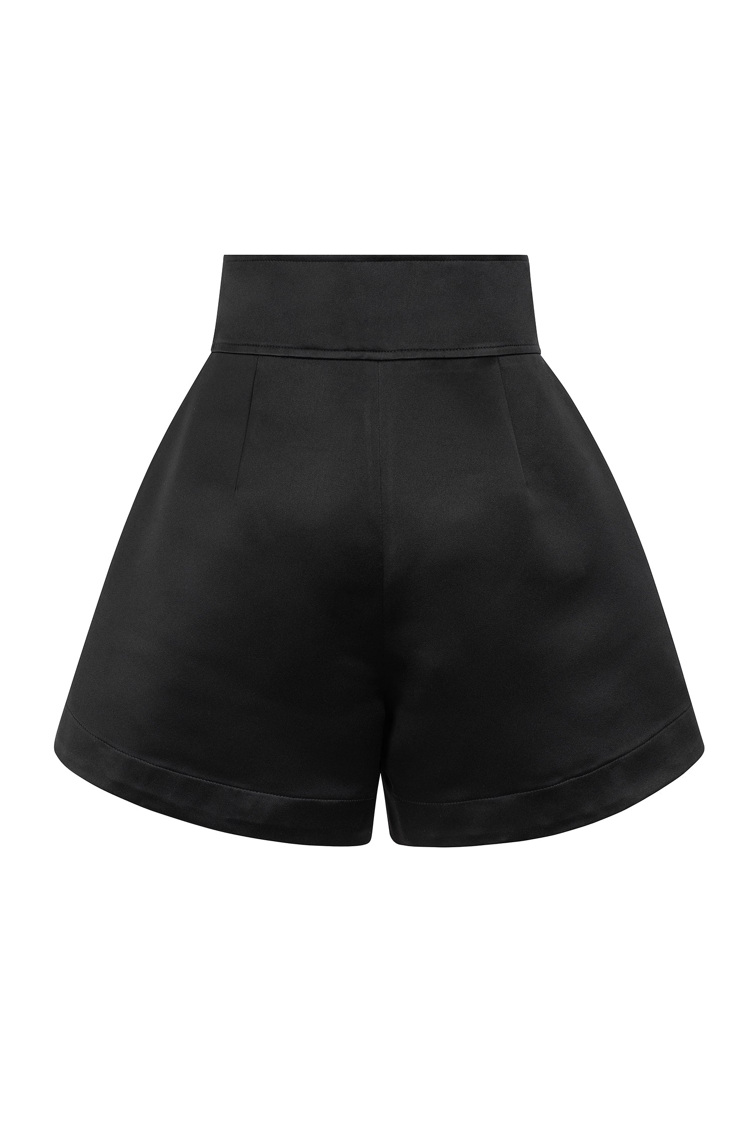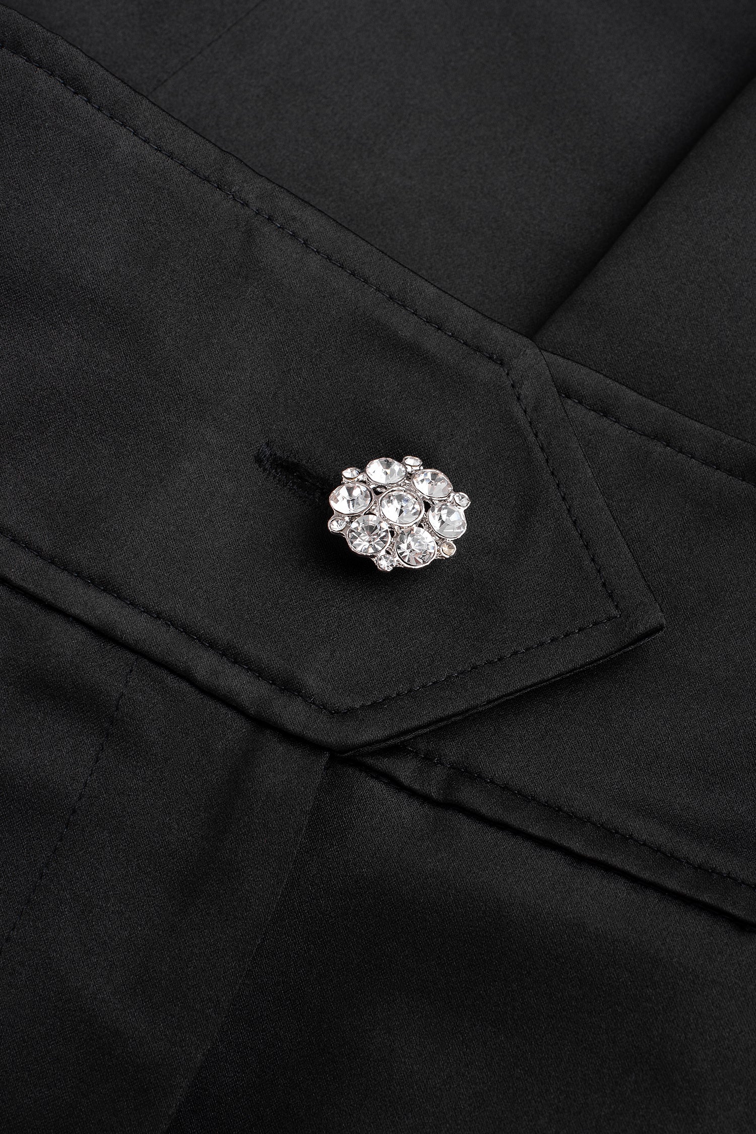 Crafted from structured satin fabric, they provide a refined shape and luxurious feel. The front fastening includes a sparkling rhinestone button and zipper, complemented by practical side pockets.
