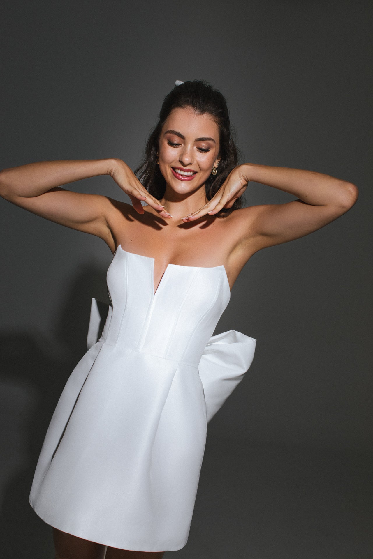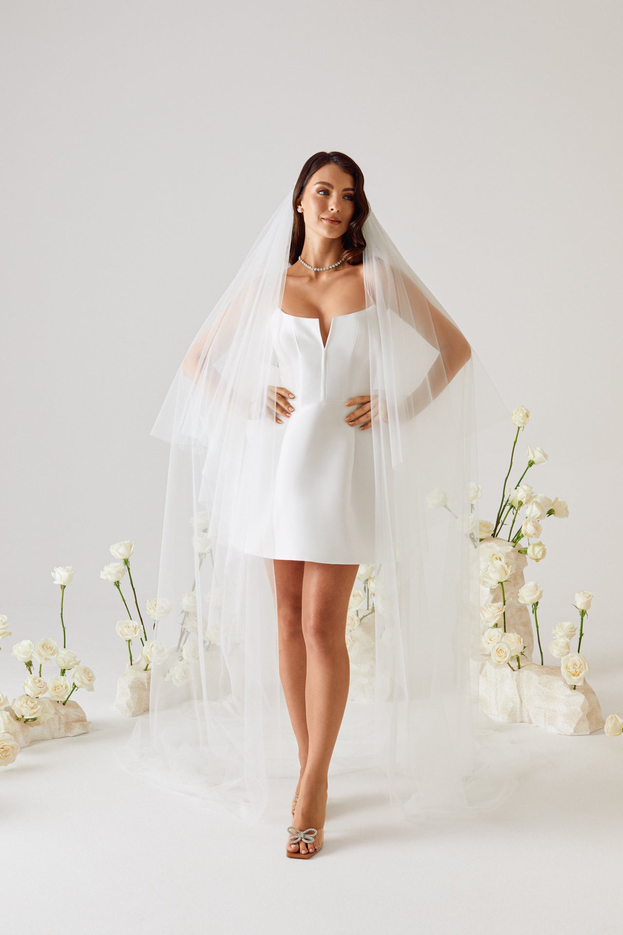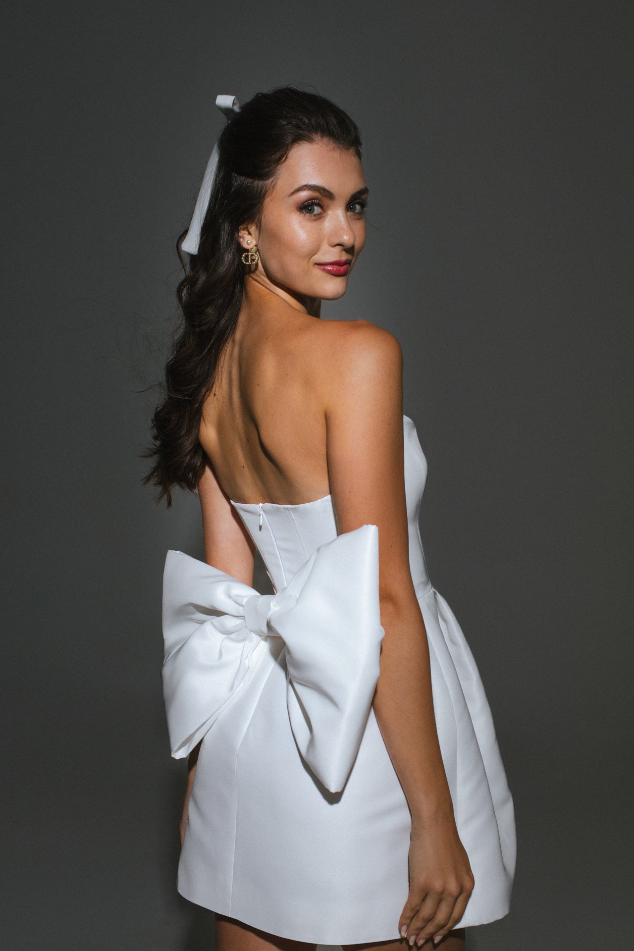 The Camellia mini dress is designed for brides who want to extend the celebration in style. Playful yet sophisticated, it’s the perfect second look — light, modern, and effortless to dance the night away. Crafted with the same couture attention as our gowns, Camellia offers a shorter silhouette that feels fresh without losing bridal elegance. Whether worn for the reception, after-party, or as a surprise change, it’s the ultimate companion to your ceremony dress. Pair it with our signature accessories or a delicate veil for a touch of romance in a modern, fun way.