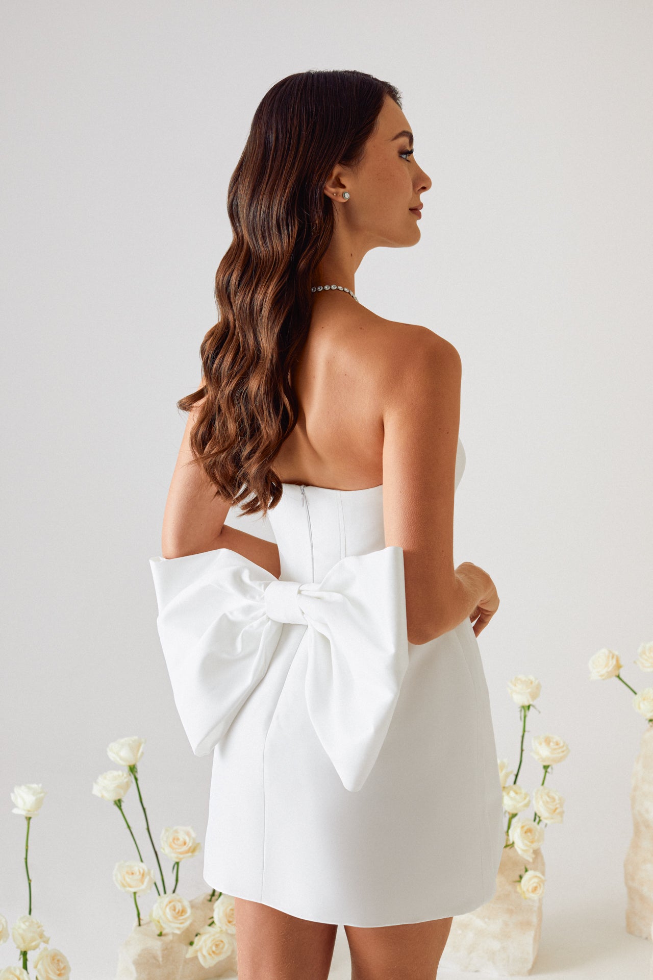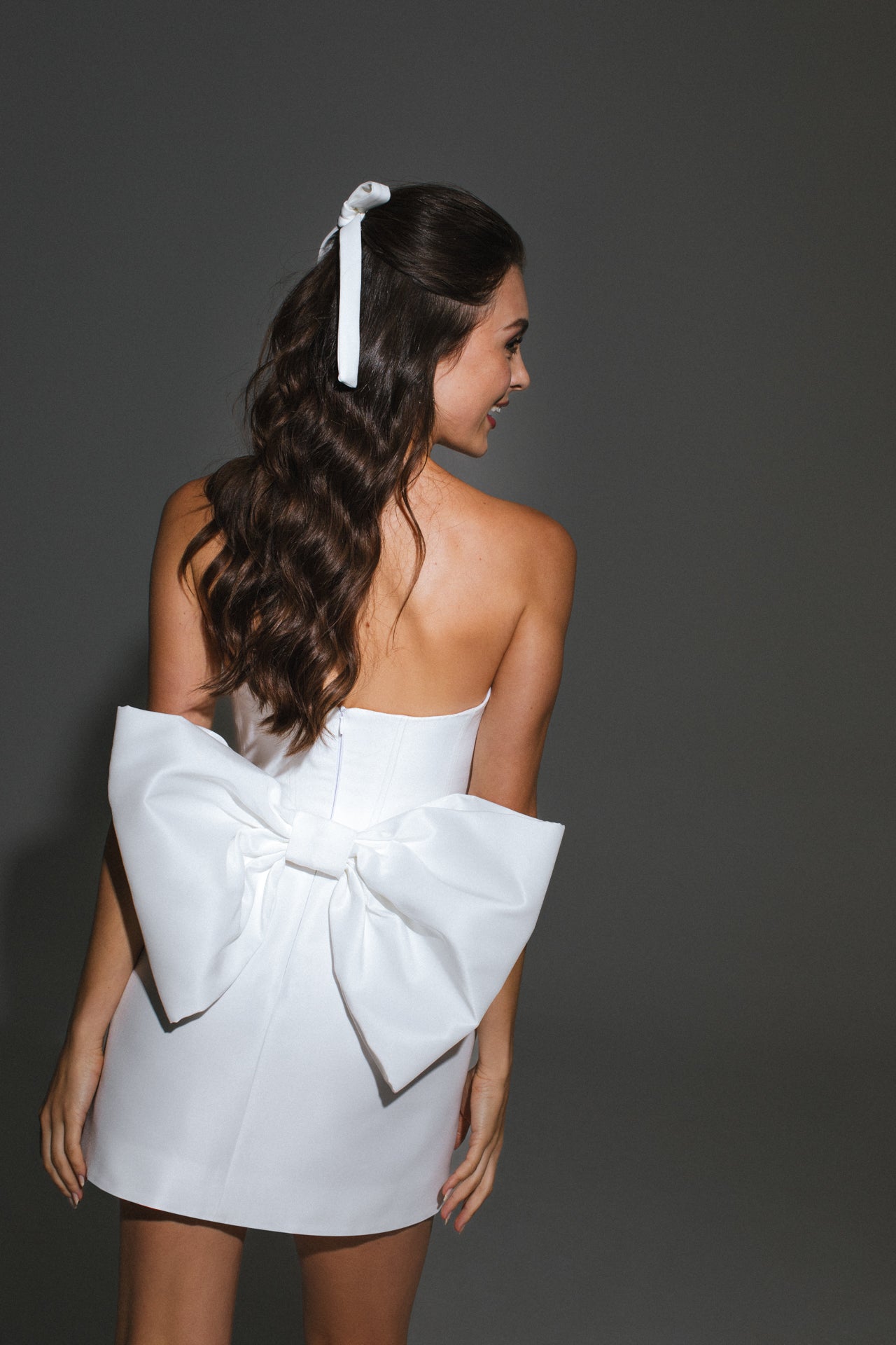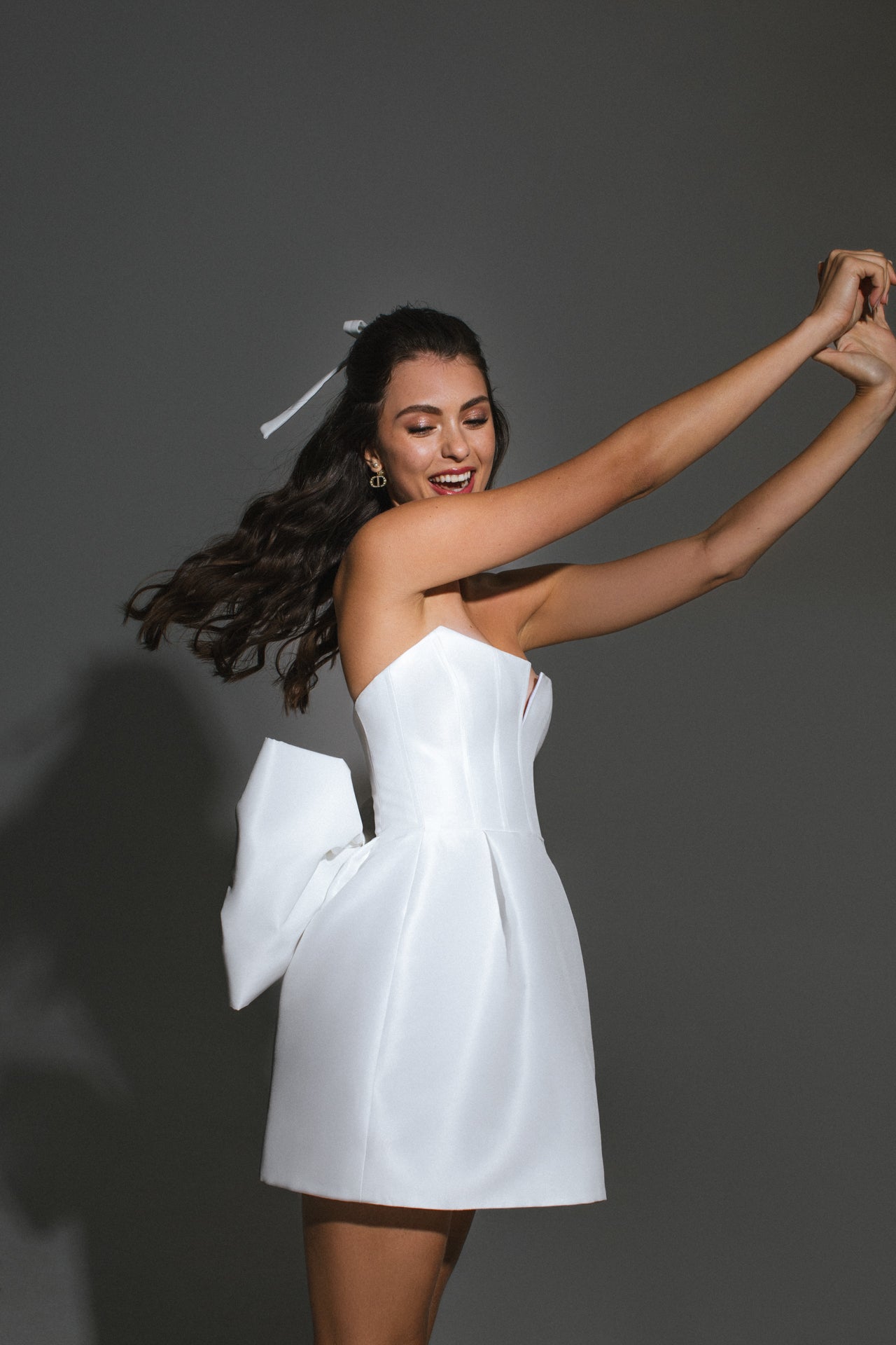 The Camellia mini dress is designed for brides who want to extend the celebration in style. Playful yet sophisticated, it’s the perfect second look — light, modern, and effortless to dance the night away. Crafted with the same couture attention as our gowns, Camellia offers a shorter silhouette that feels fresh without losing bridal elegance. Whether worn for the reception, after-party, or as a surprise change, it’s the ultimate companion to your ceremony dress. Pair it with our signature accessories or a delicate veil for a touch of romance in a modern, fun way.