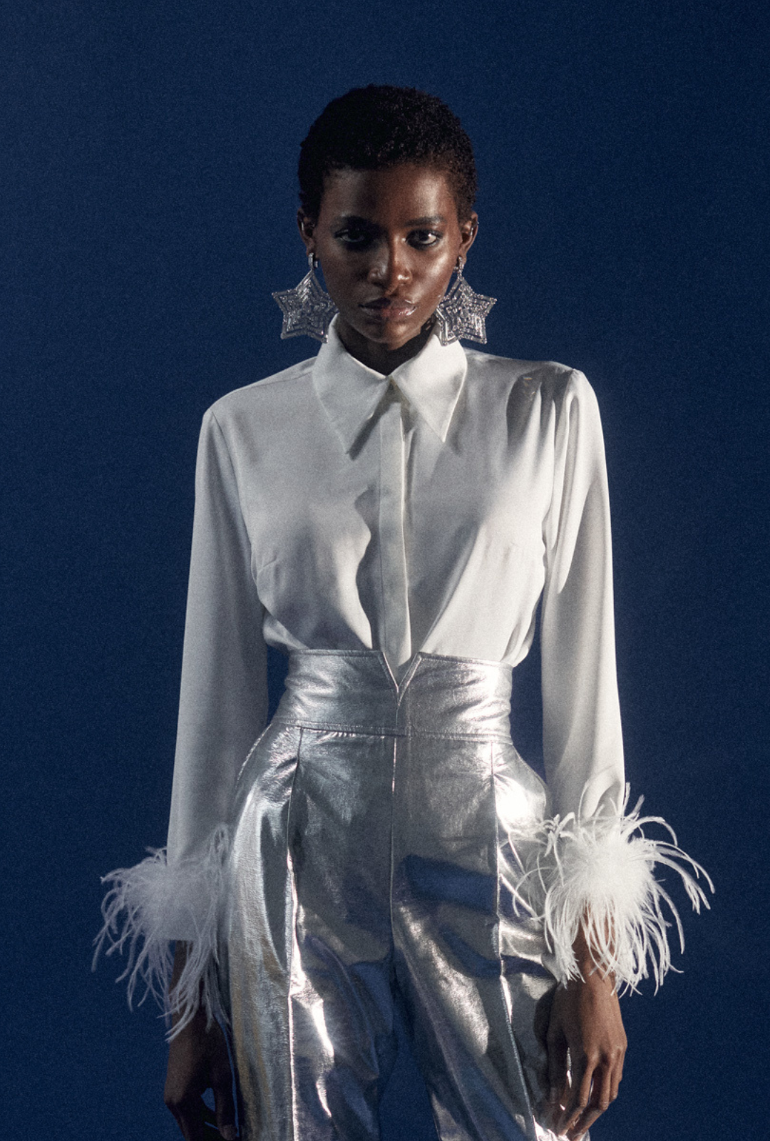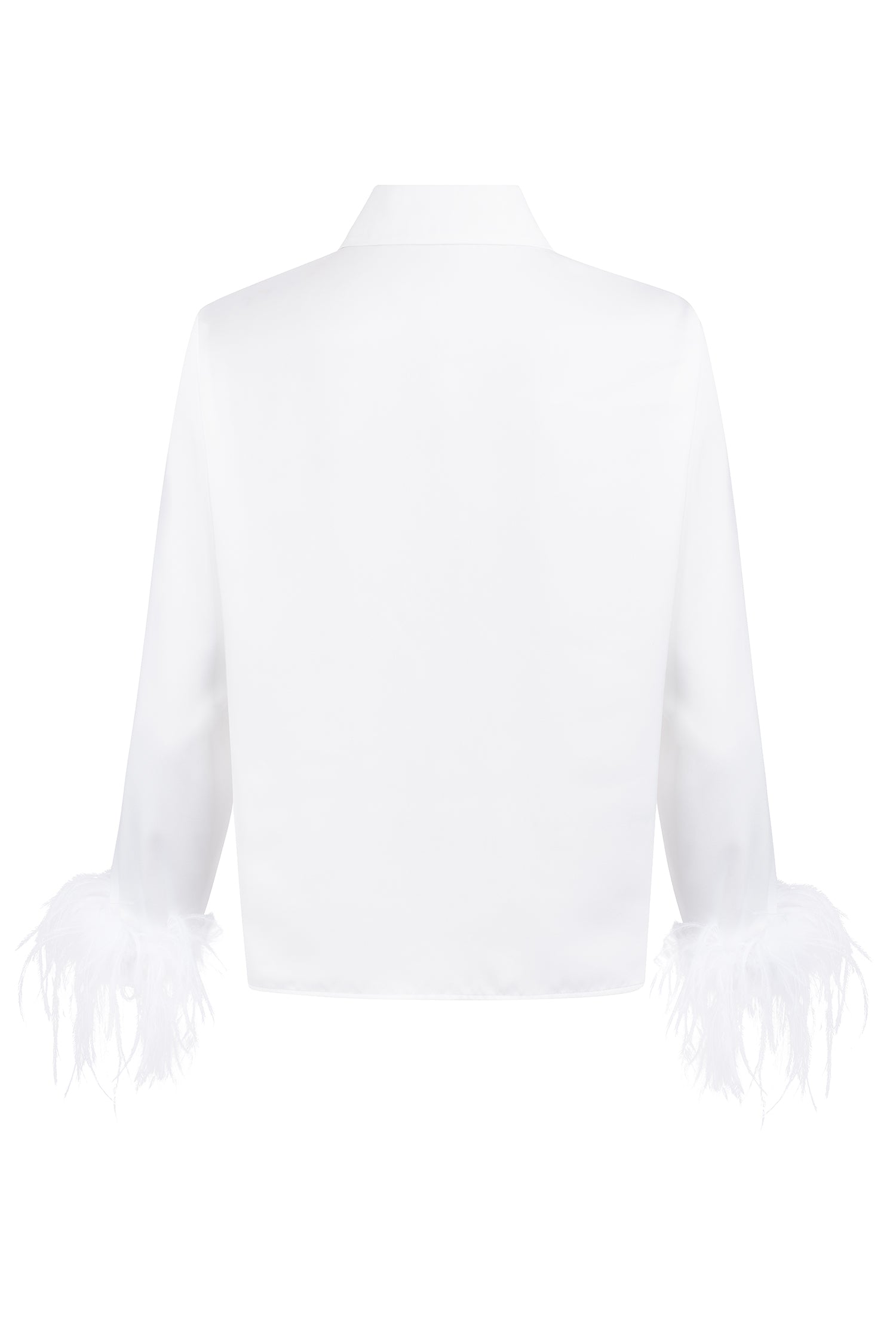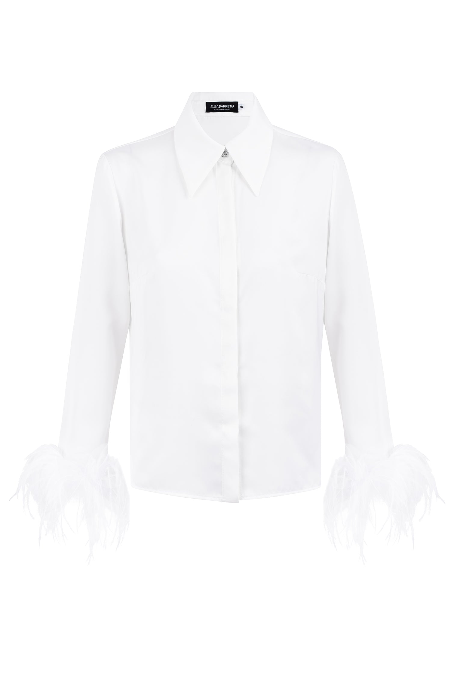 Our feathered shirt is crafted from a delicate, satin-like fabric that feels soft and comfortable. It features a feminine cut, a concealed button placket, and a statement rhinestone button at the collar.