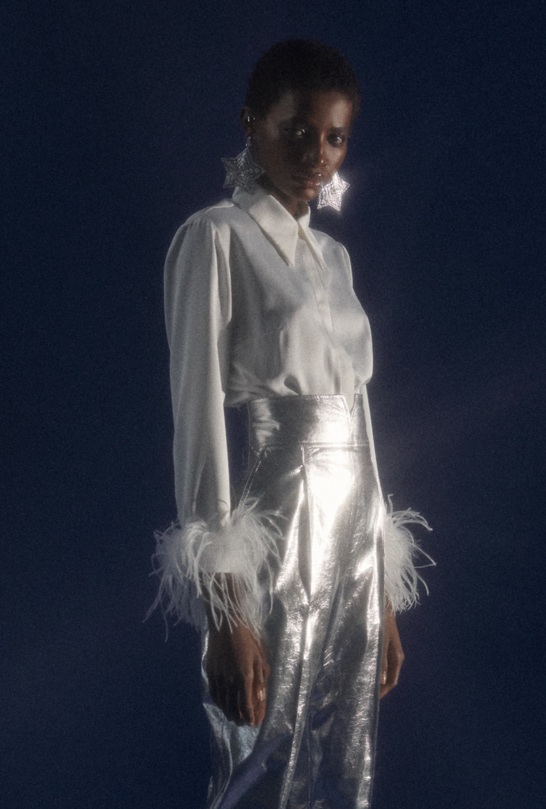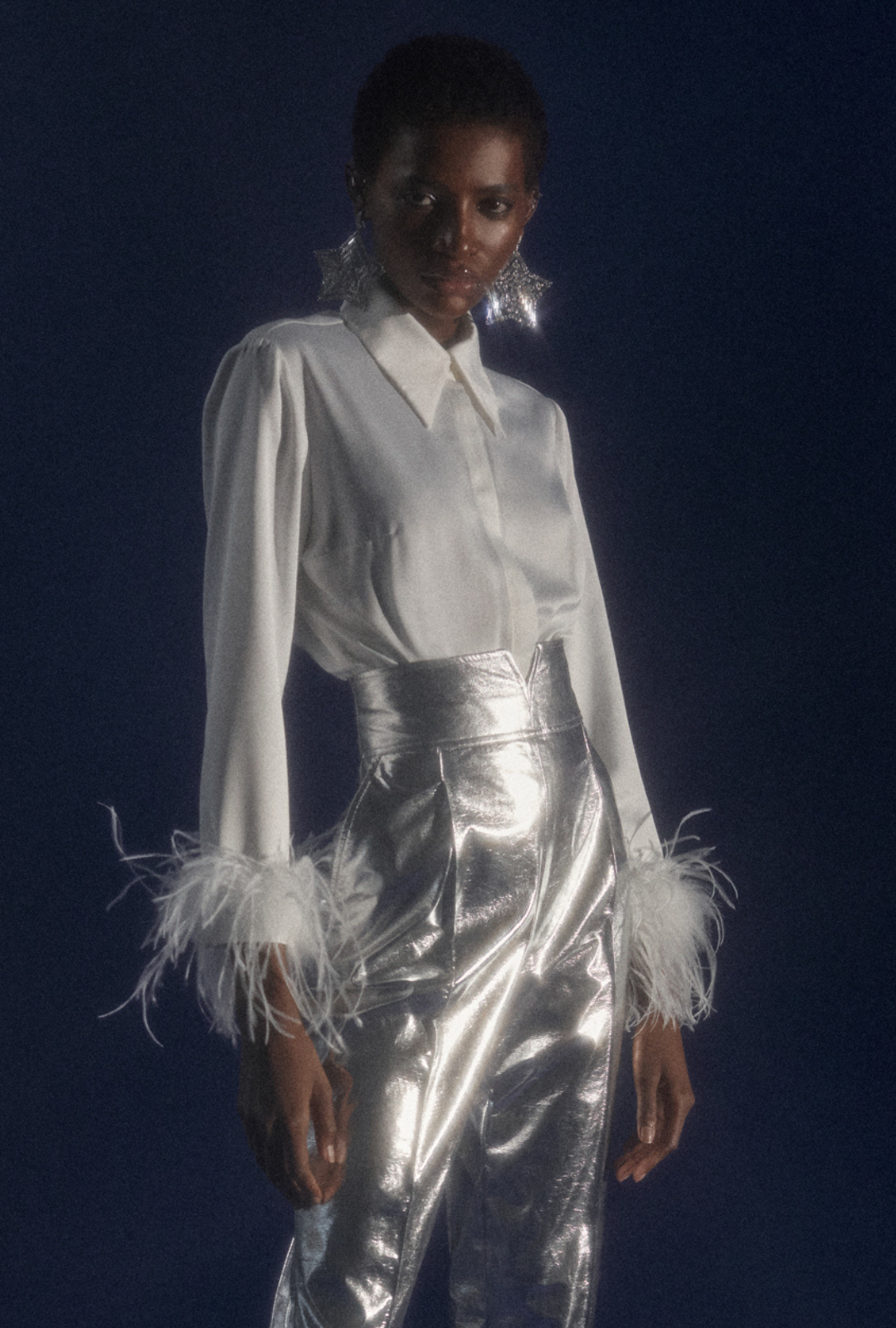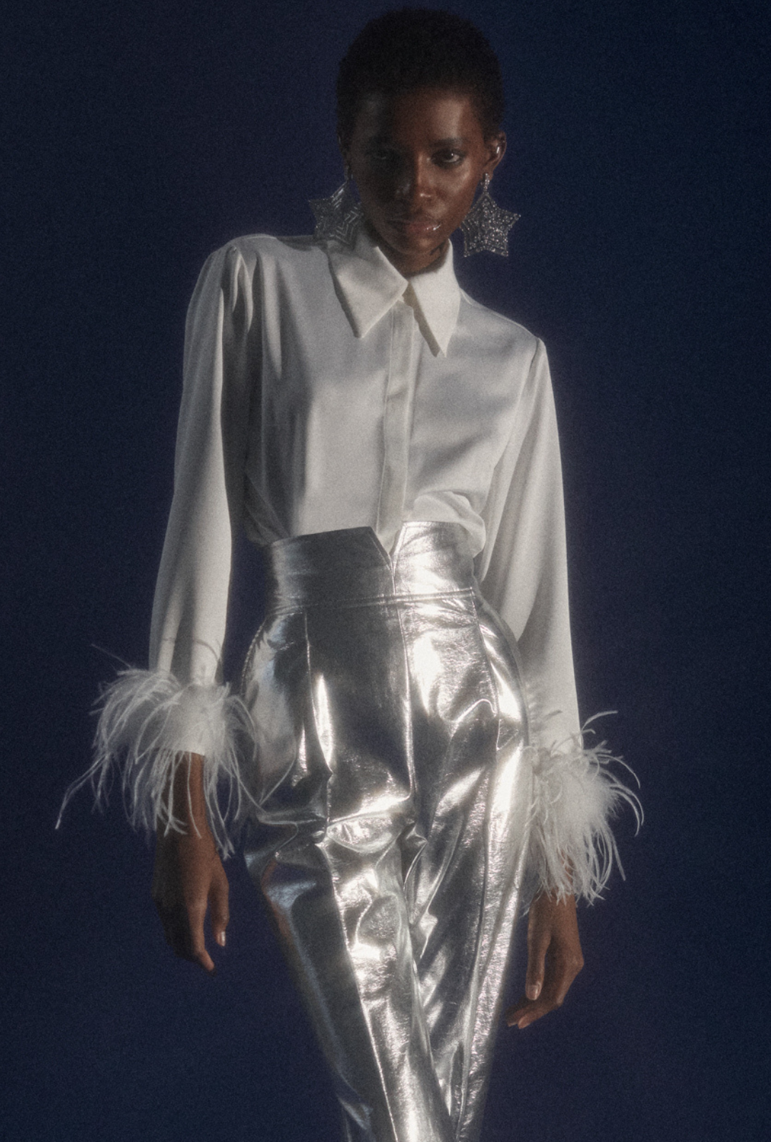 Our feathered shirt is crafted from a delicate, satin-like fabric that feels soft and comfortable. It features a feminine cut, a concealed button placket, and a statement rhinestone button at the collar.