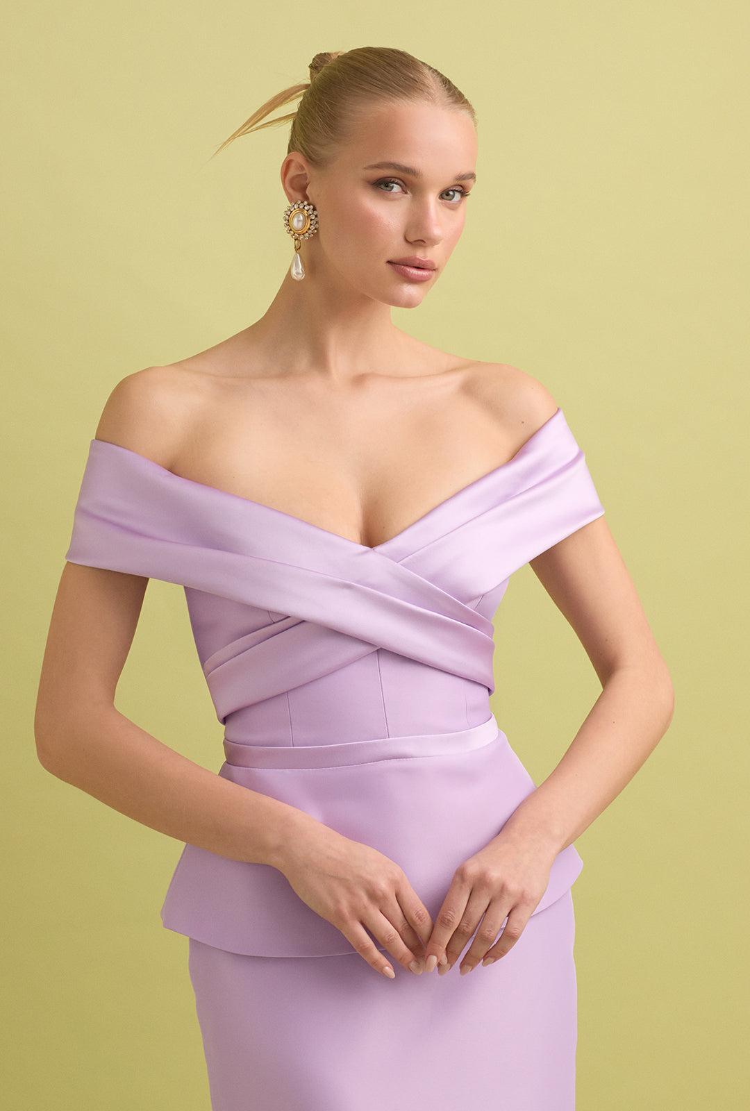 This off-the-shoulder top highlights the neckline and defines the waist with a structured fit. The subtle peplum cut flares gently from the waist, creating a flattering silhouette that feels polished — and cleverly conceals any bloating. Pair it with the matching skirt for a sophisticated total look that’s cocktail-ready.