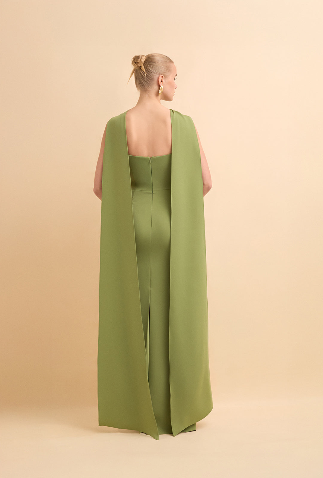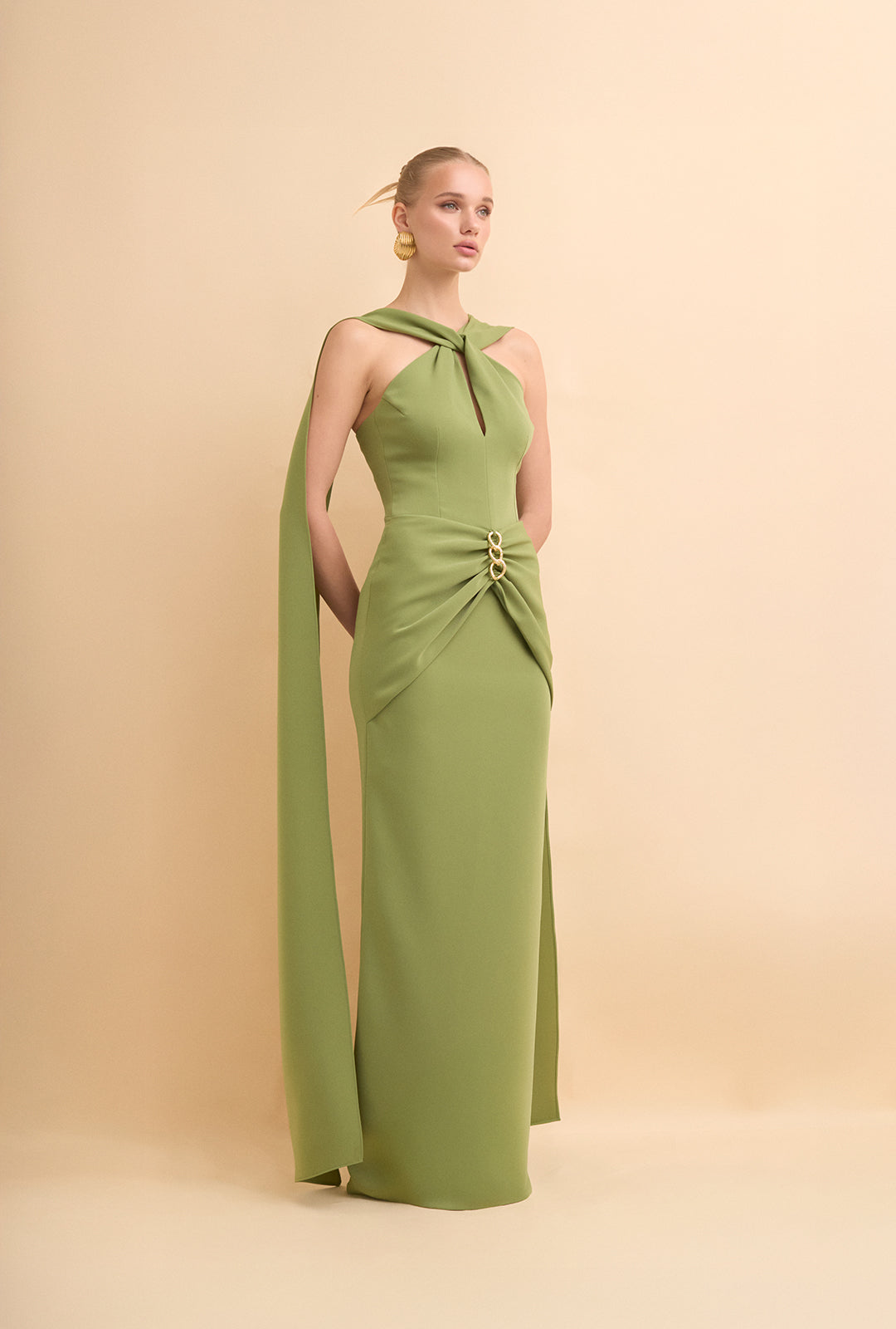 Crafted in our signature pistachio green crepe, this floor-length gown is designed to captivate. The silhouette features a sculpted bodice that contours the torso, enhancing the natural curves with refined elegance. A gold-tone chain detail at the waist creates a softly draped effect that accentuates the hips, adding dimension and movement.