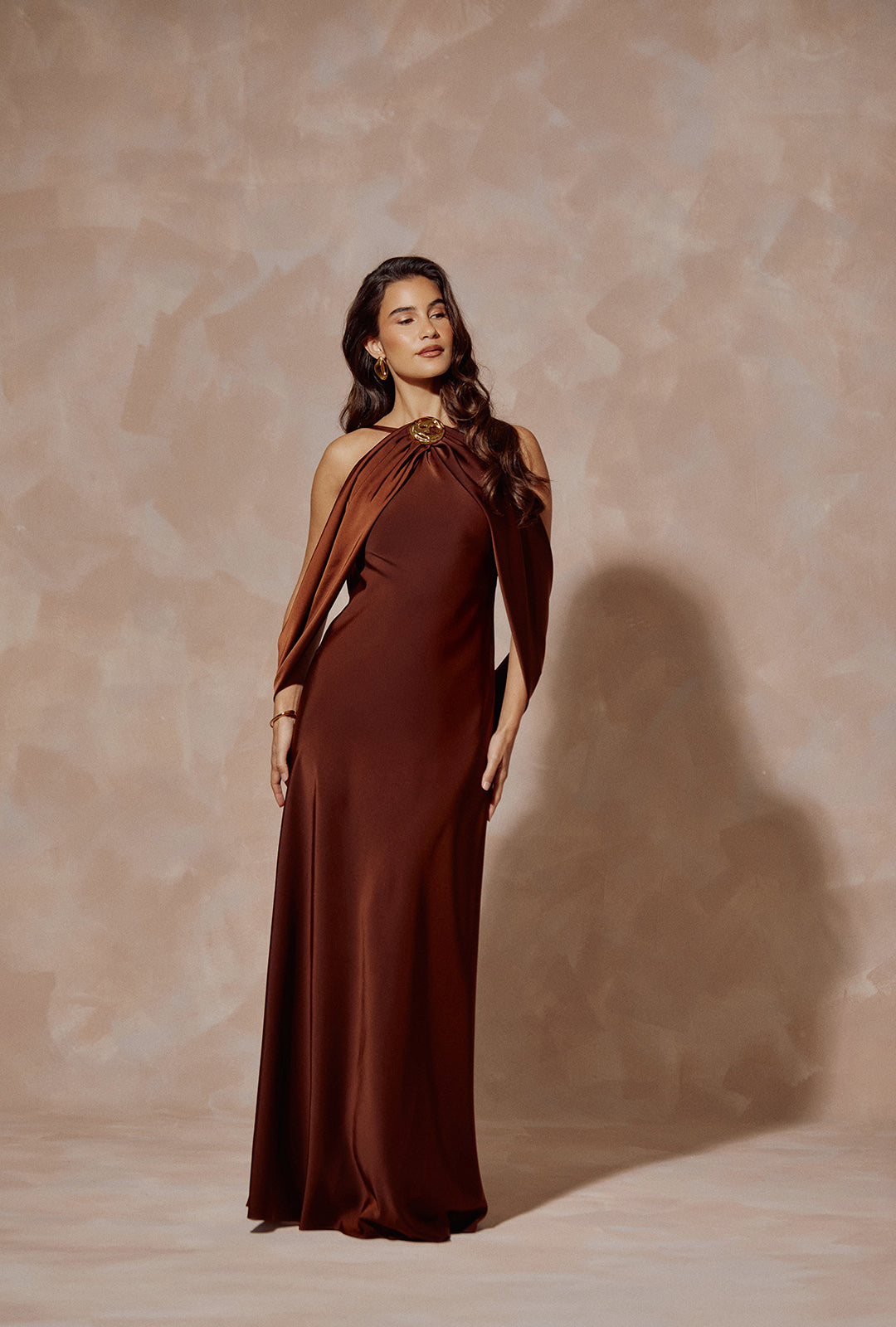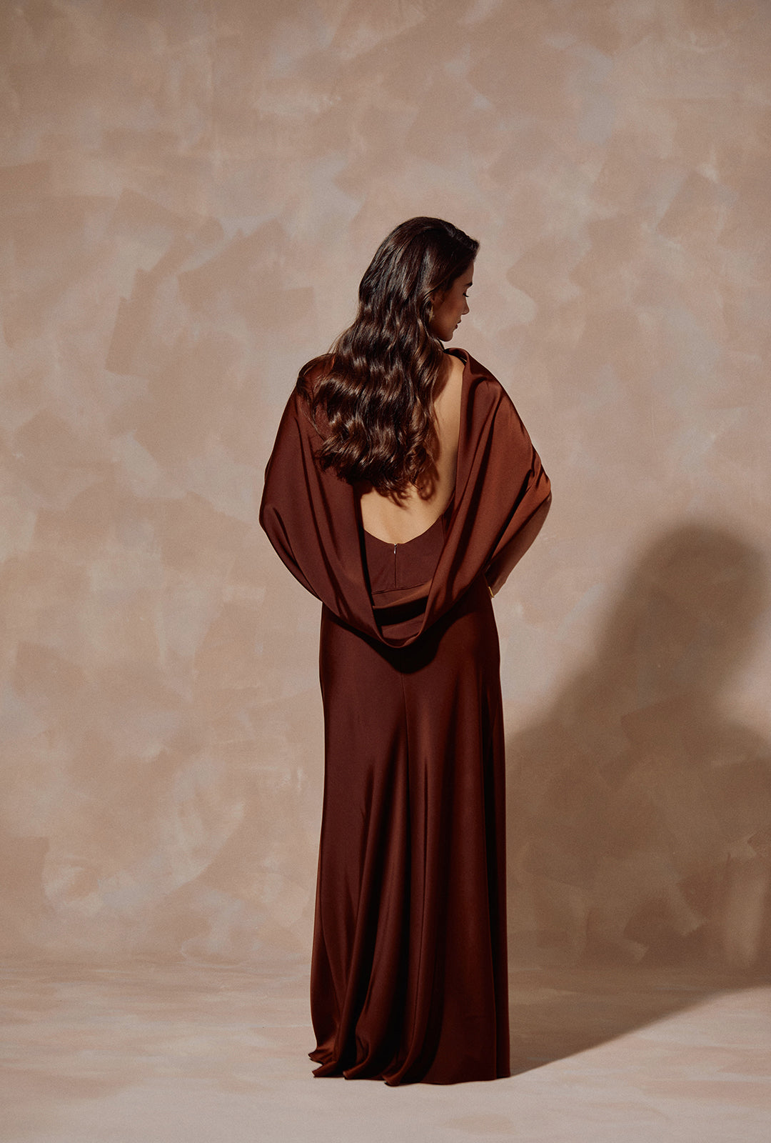 Crafted in fluid satin in a rich chocolate brown tone, this long dress is designed to move effortlessly with the body, creating an elegant and elongated silhouette. The soft, luminous fabric enhances its lightness, making it the perfect choice for warm-weather occasions.