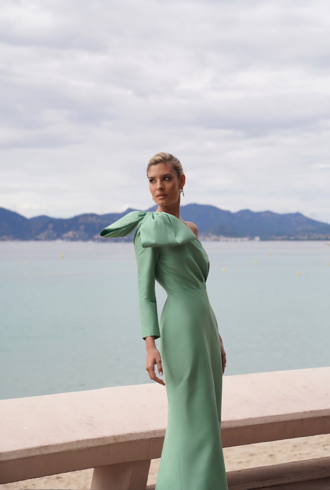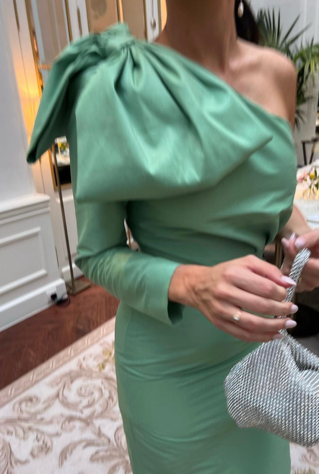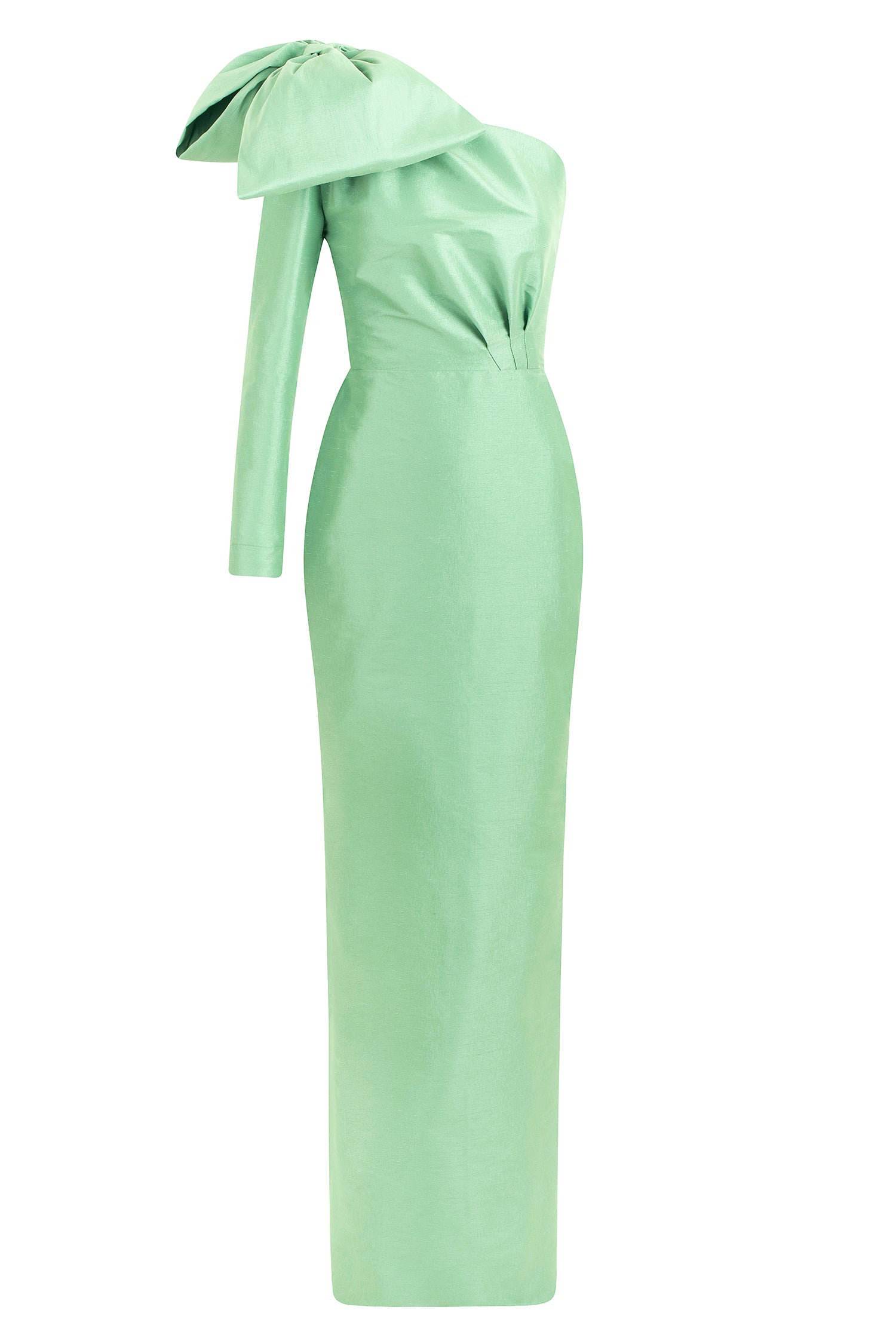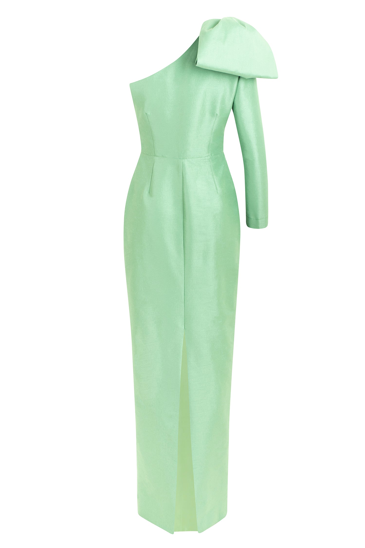 Embrace contemporary glamour with this ultra-feminine and elegant gown, perfect for any event that calls for a fancy dress code. Designed with a voluminous bow on the right shoulder, this gown features a silhouette-enhancing fit, a single sleeve on the right side, an asymmetrical neckline, and a subtly lustrous taffeta fabric that adds a festive touch.