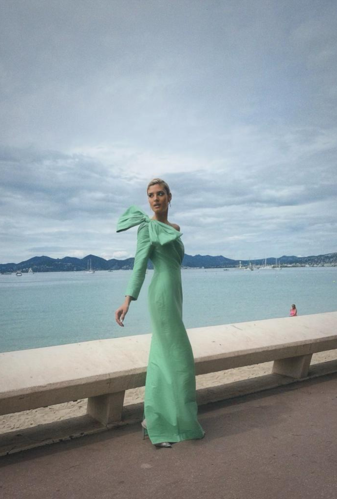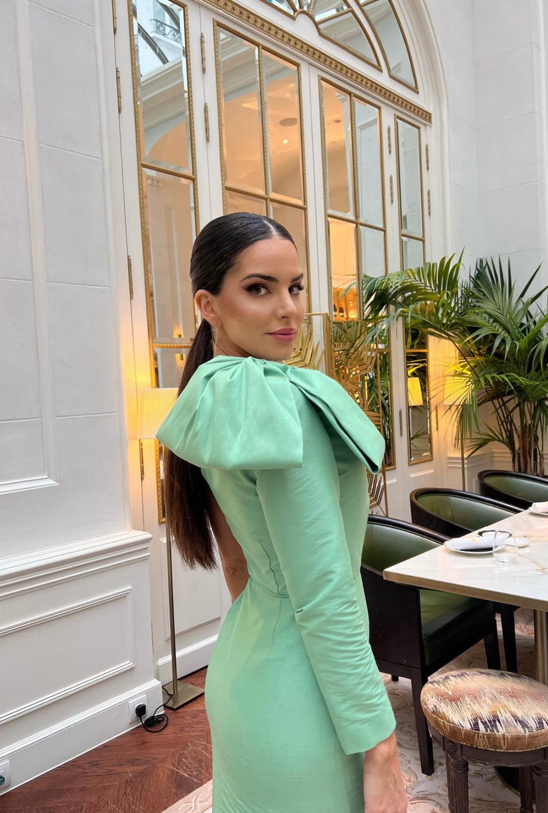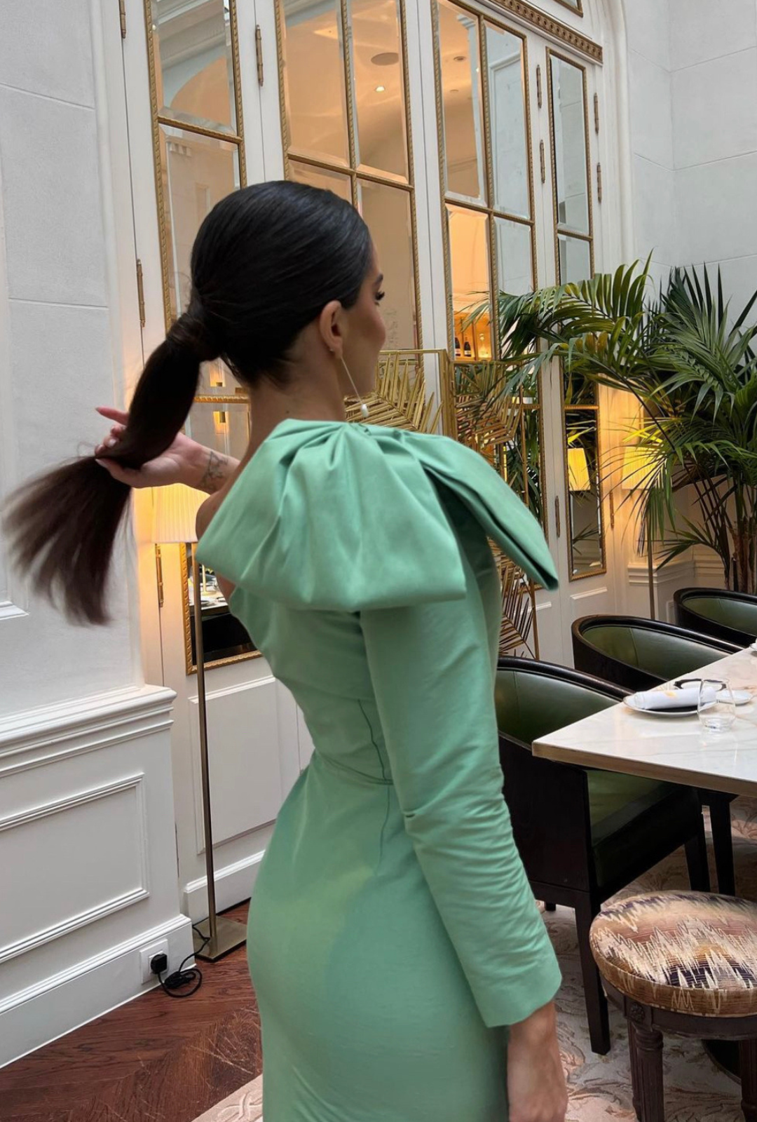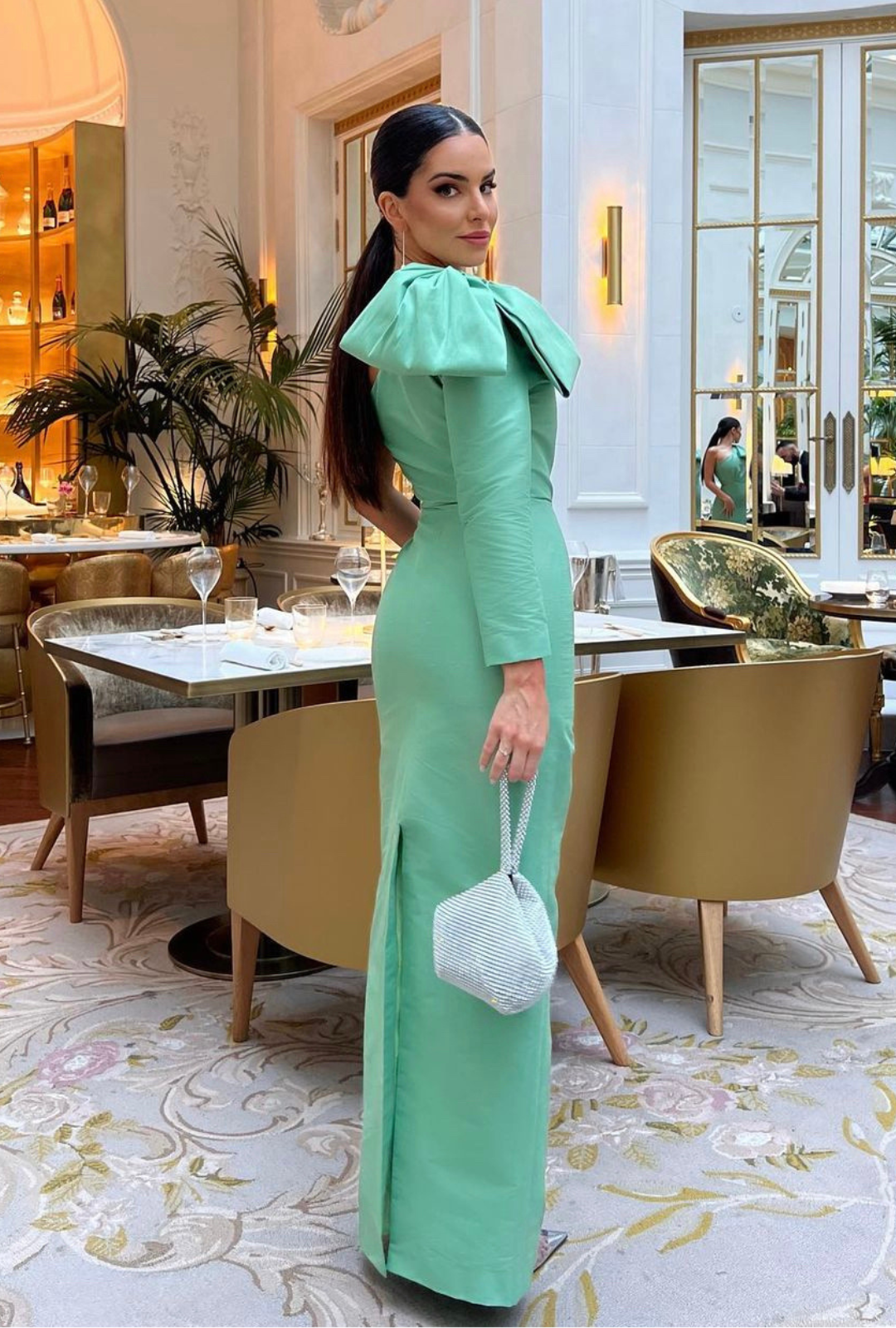 Embrace contemporary glamour with this ultra-feminine and elegant gown, perfect for any event that calls for a fancy dress code. Designed with a voluminous bow on the right shoulder, this gown features a silhouette-enhancing fit, a single sleeve on the right side, an asymmetrical neckline, and a subtly lustrous taffeta fabric that adds a festive touch.