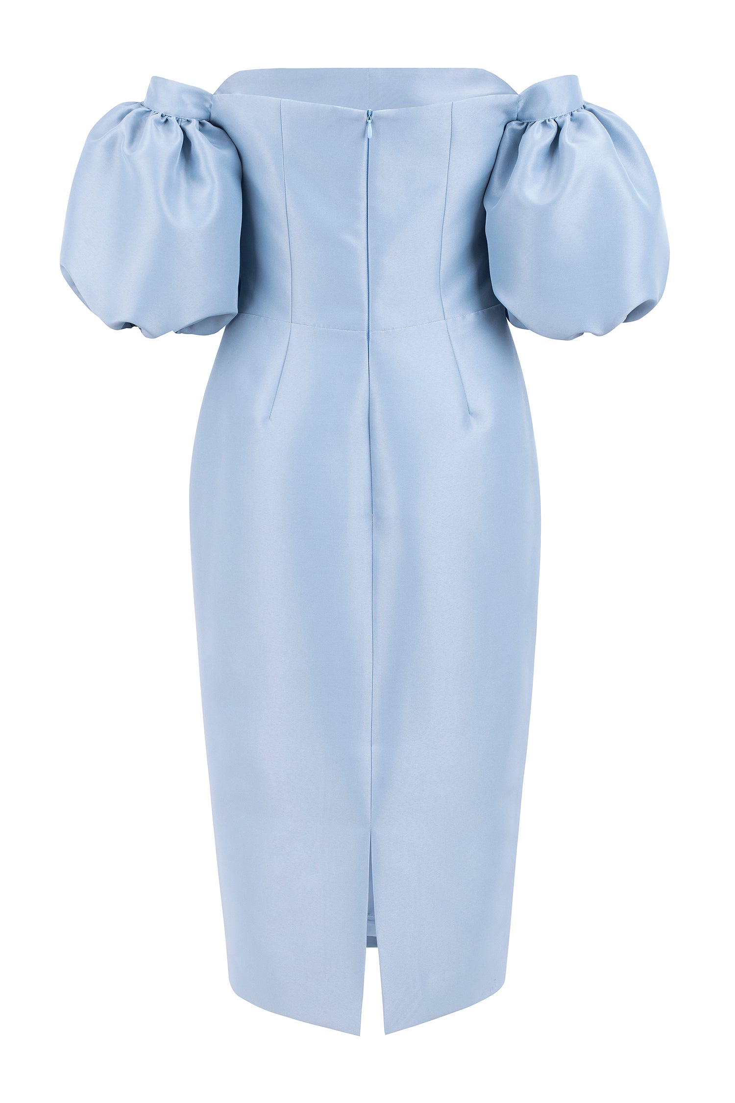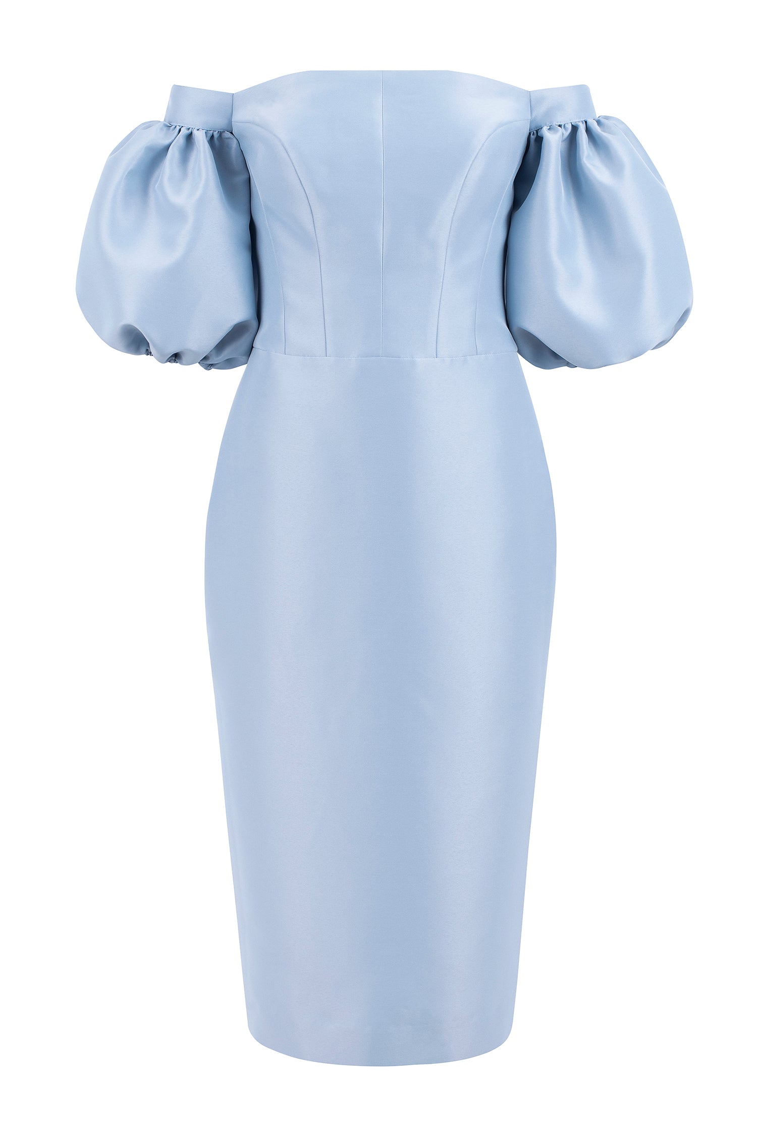 In our signature midi fit, tailored to the feminine silhouette, this dress features an off-shoulder design and voluminous sleeves.