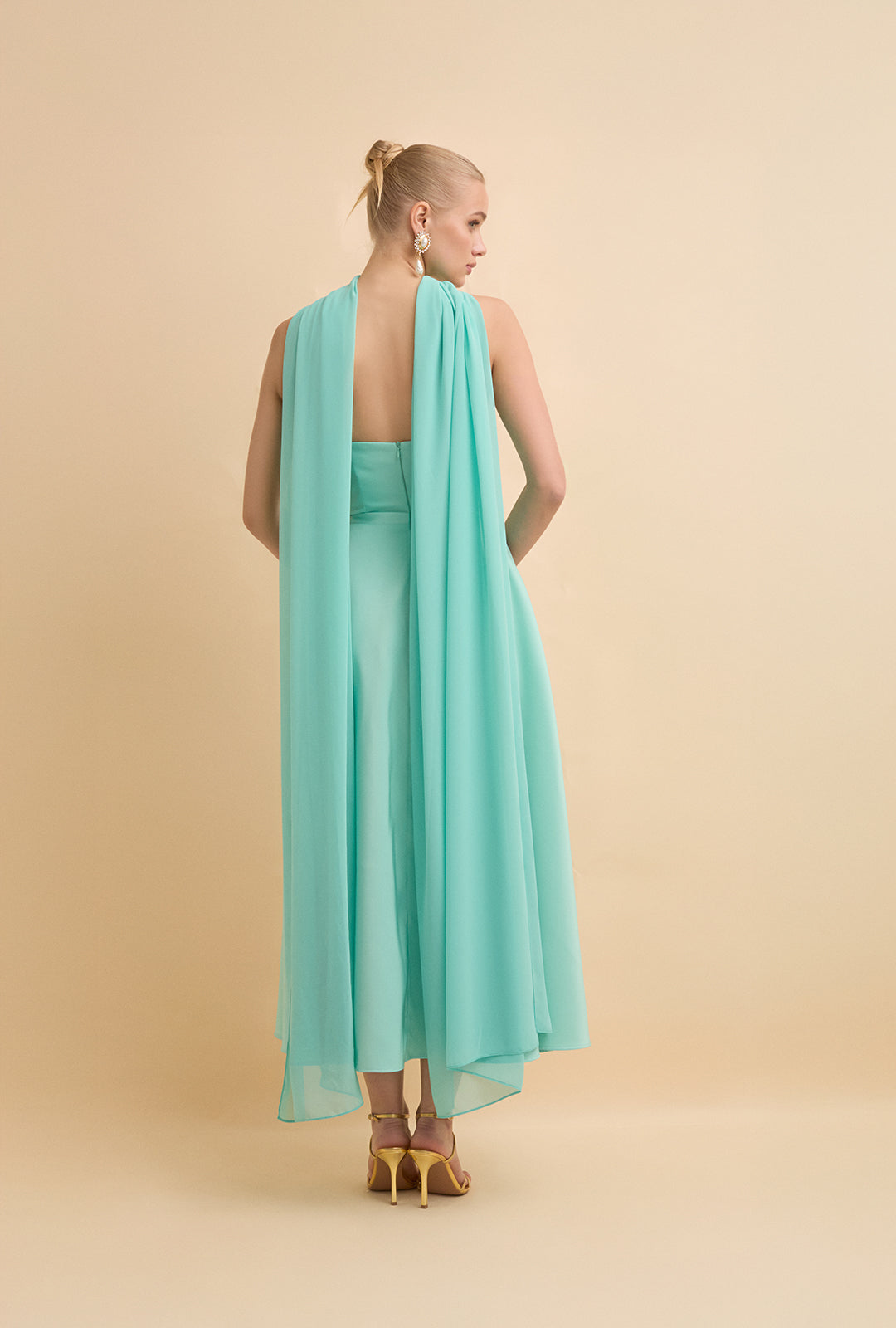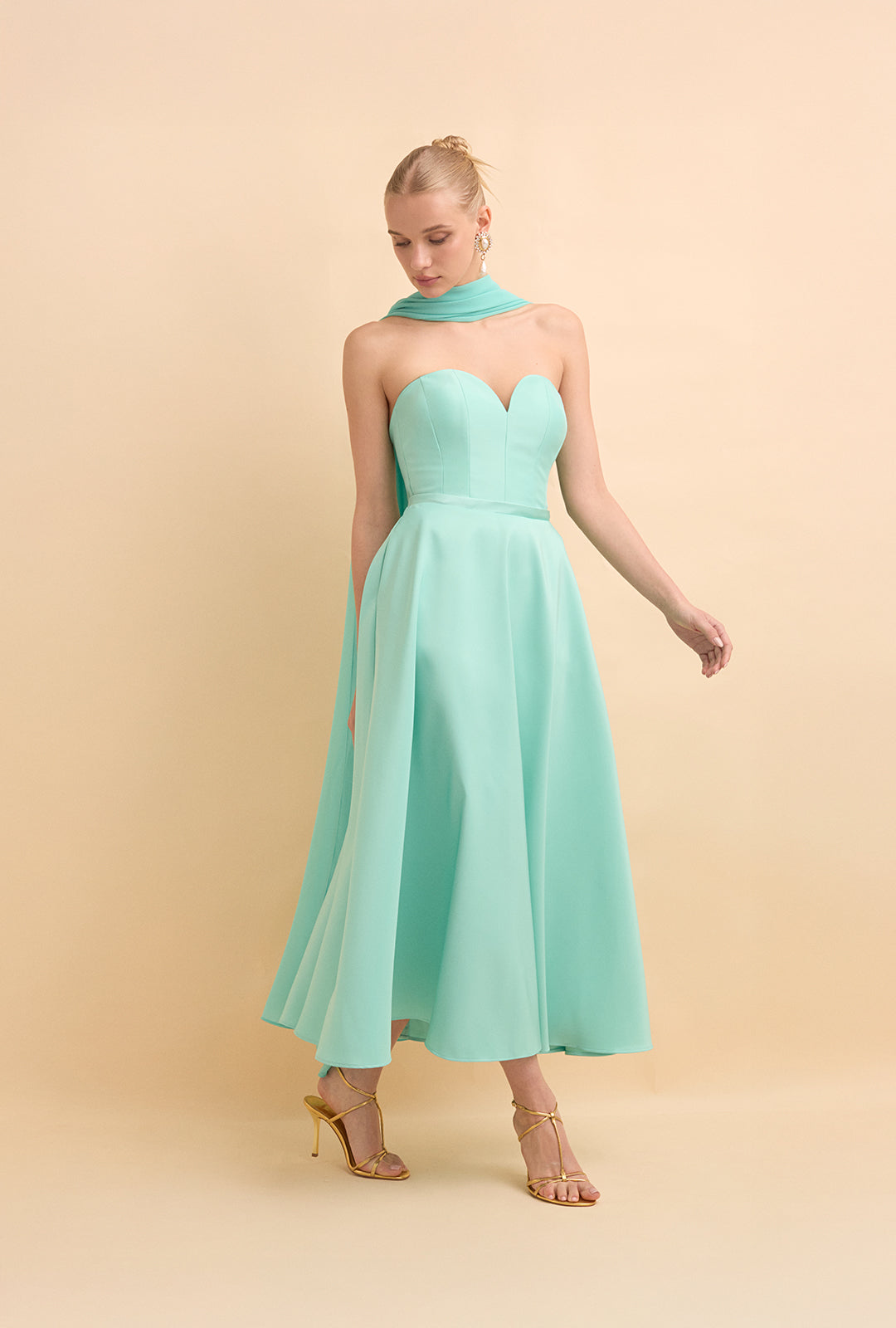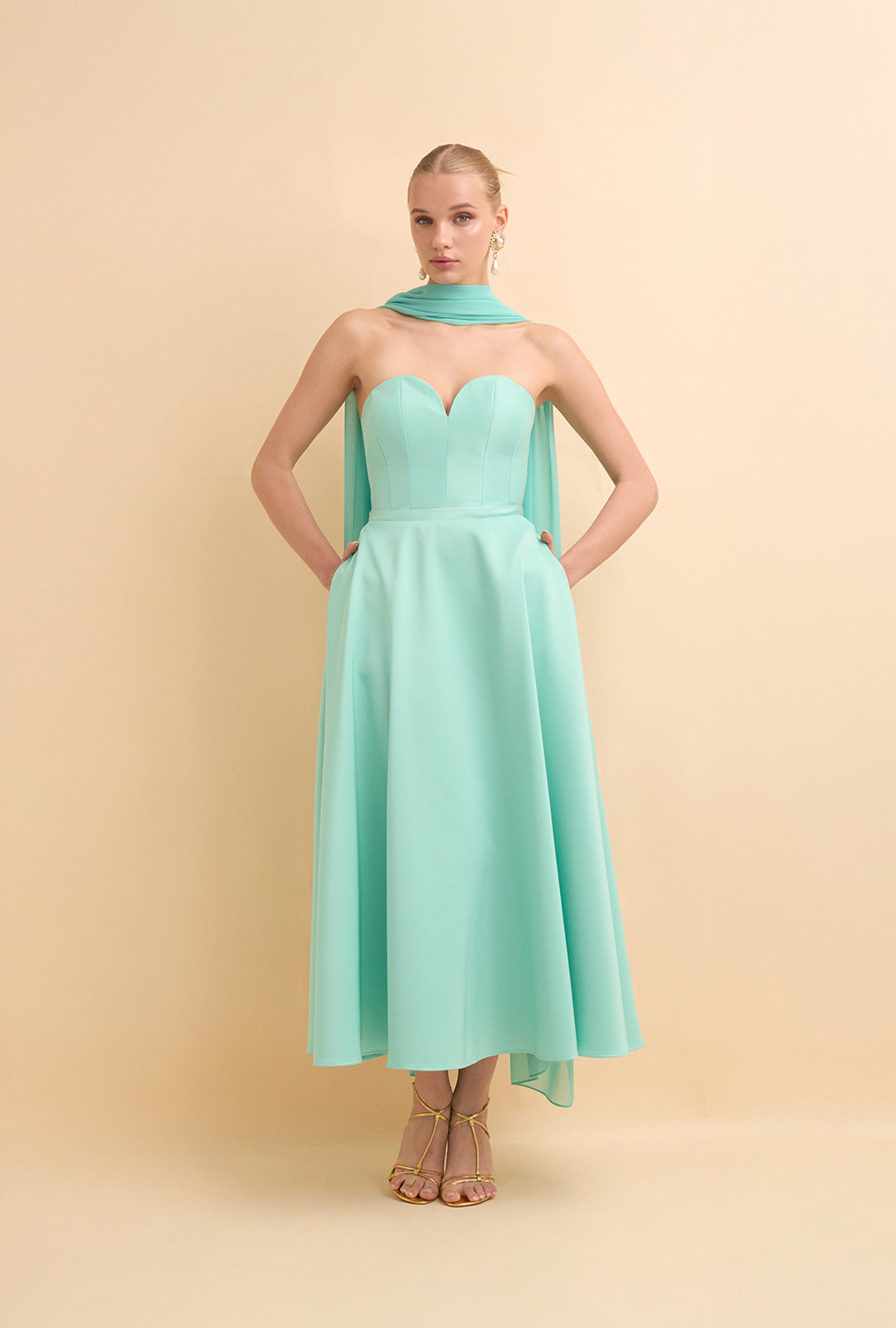 This corset-inspired midi dress features a heart-shaped neckline and a darted skirt that enhances the waist with refined structure. The fabric is crisp yet comfortable, complemented by discreet side pockets and a removable sheer cape for added movement and drama. Feminine and versatile, it’s the perfect choice for spring-summer events — wear it with or without the cape, and let the silhouette speak for itself.