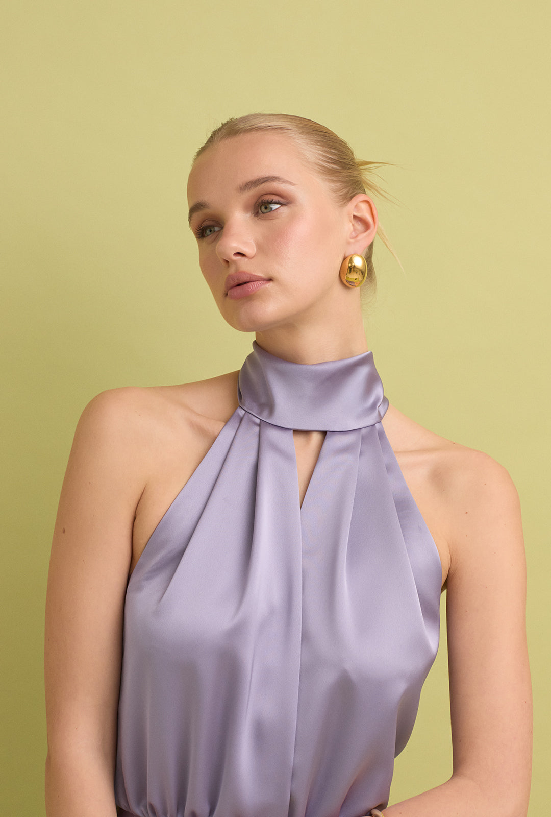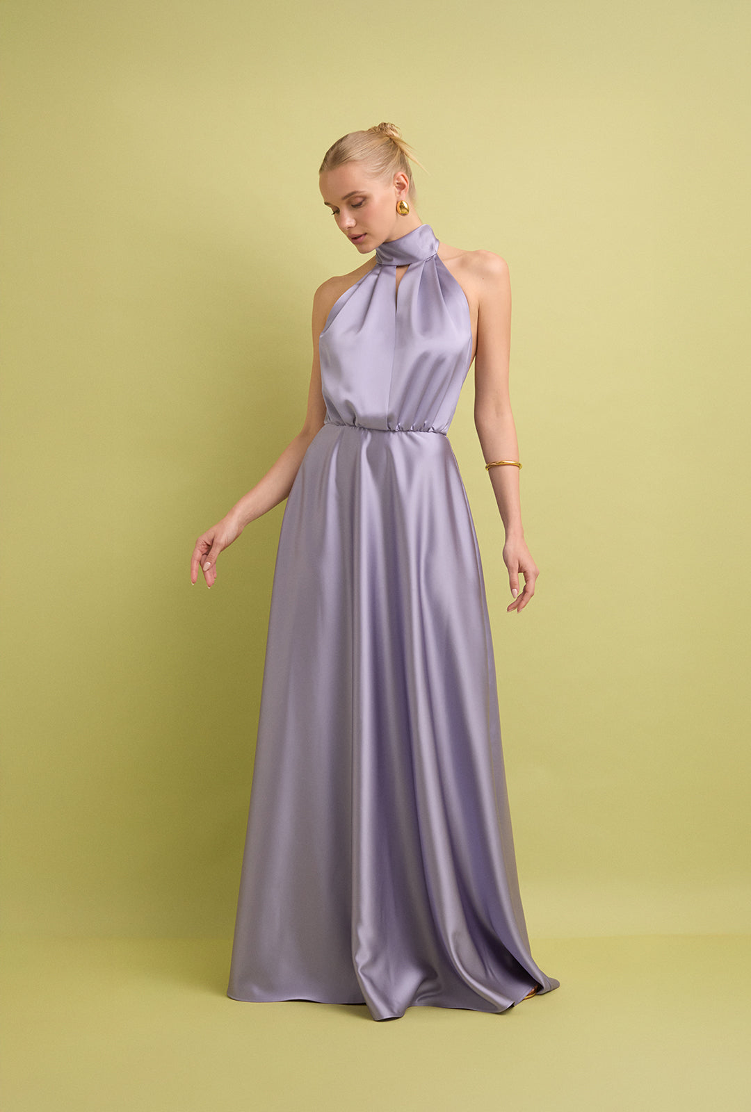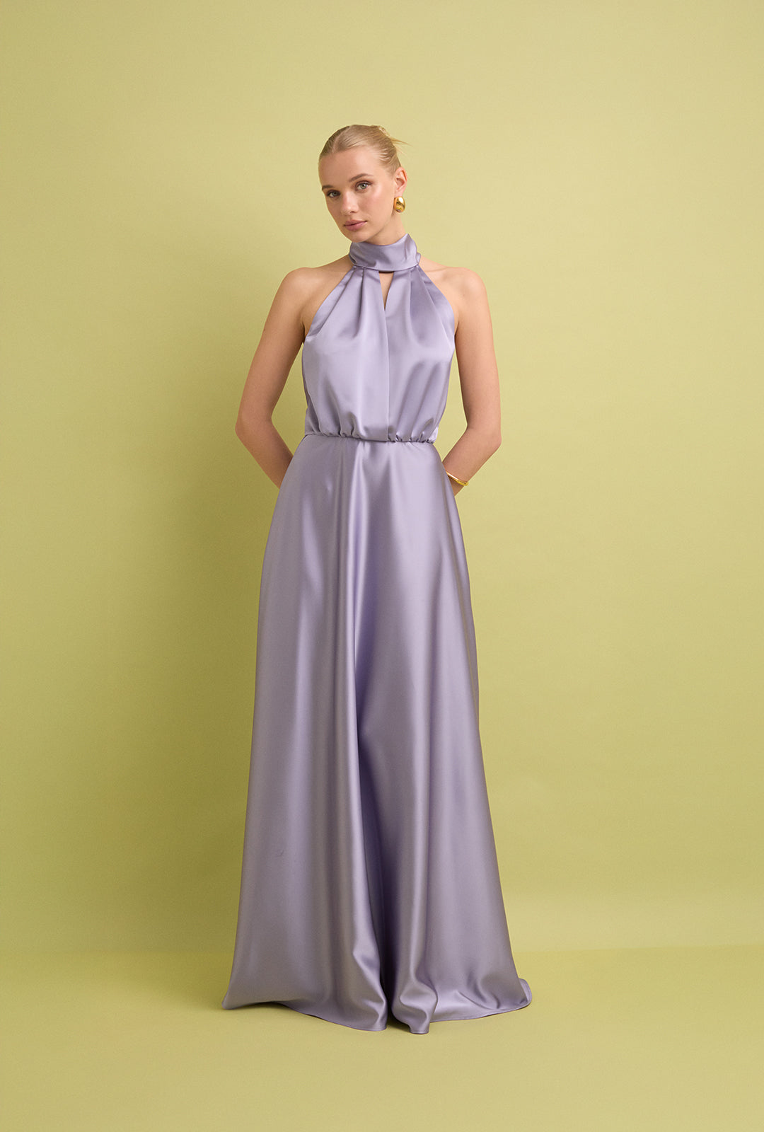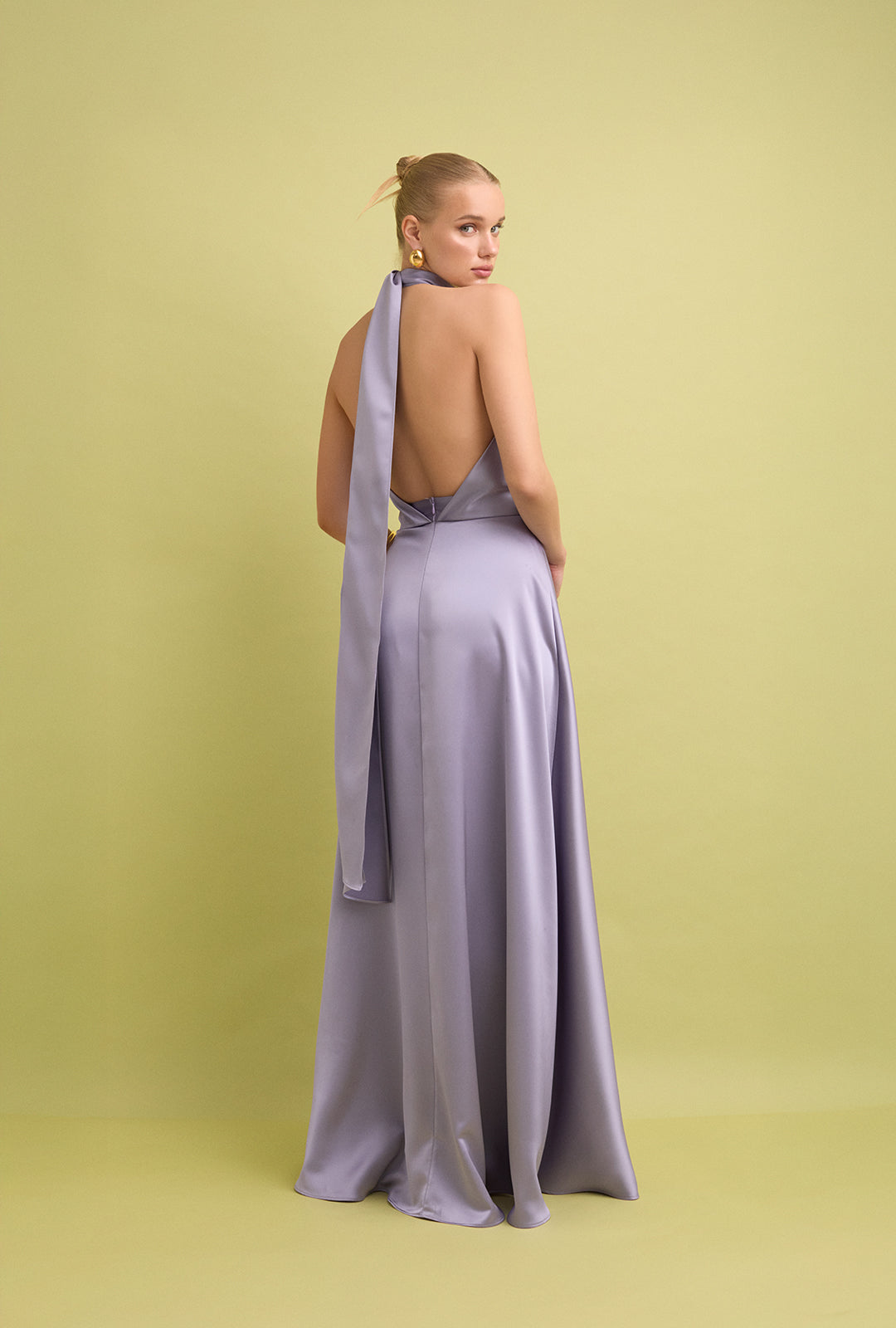 For those seeking elegance and fluidity, this dress is the perfect choice. Designed with an open back and a refined high neckline, it features two elongated ties that cascade beautifully down the length of the dress.