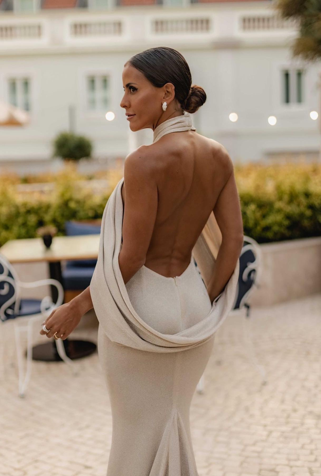 Designed to sculpt and enhance the female silhouette, this gown features an open-back design, a striking mermaid cut, and a dramatic trailing hemline. The standout detail? A sophisticated crossover high-neck collar that drapes elegantly over the shoulders, cascading into the open back for a stunning effect.