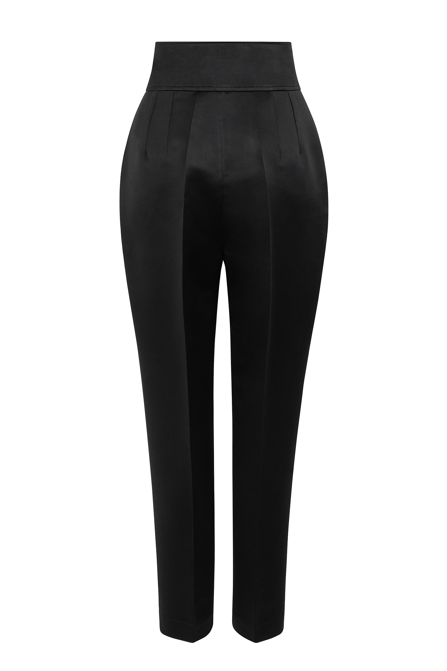 Featuring the iconic high-waisted fit of our signature structured trousers, now reimagined in a party-glam version. Crafted from structured satin fabric, these tapered trousers boast a classic cut, pressed creases, and side pockets. They fasten at the front with a fly closure and a dazzling rhinestone button.