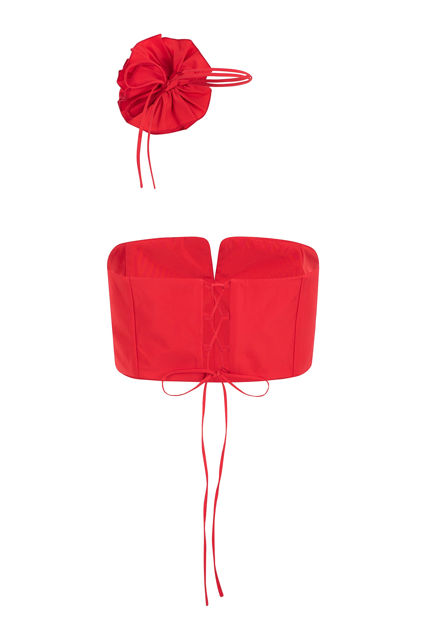 The most romantic piece of the Soirée D’Été collection is this Bandeau Crop Top crafted from tafeta fabric with a V-shaped detail on the neckline. The top fastens at the back with a crisscross design, allowing for a perfect fit. The flower, made from the same fabric, can be worn with or without the top, offering versatility in styling.