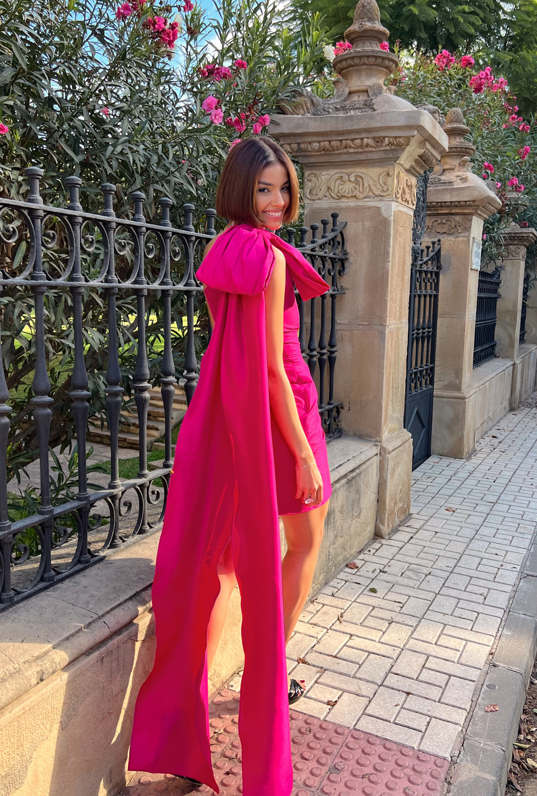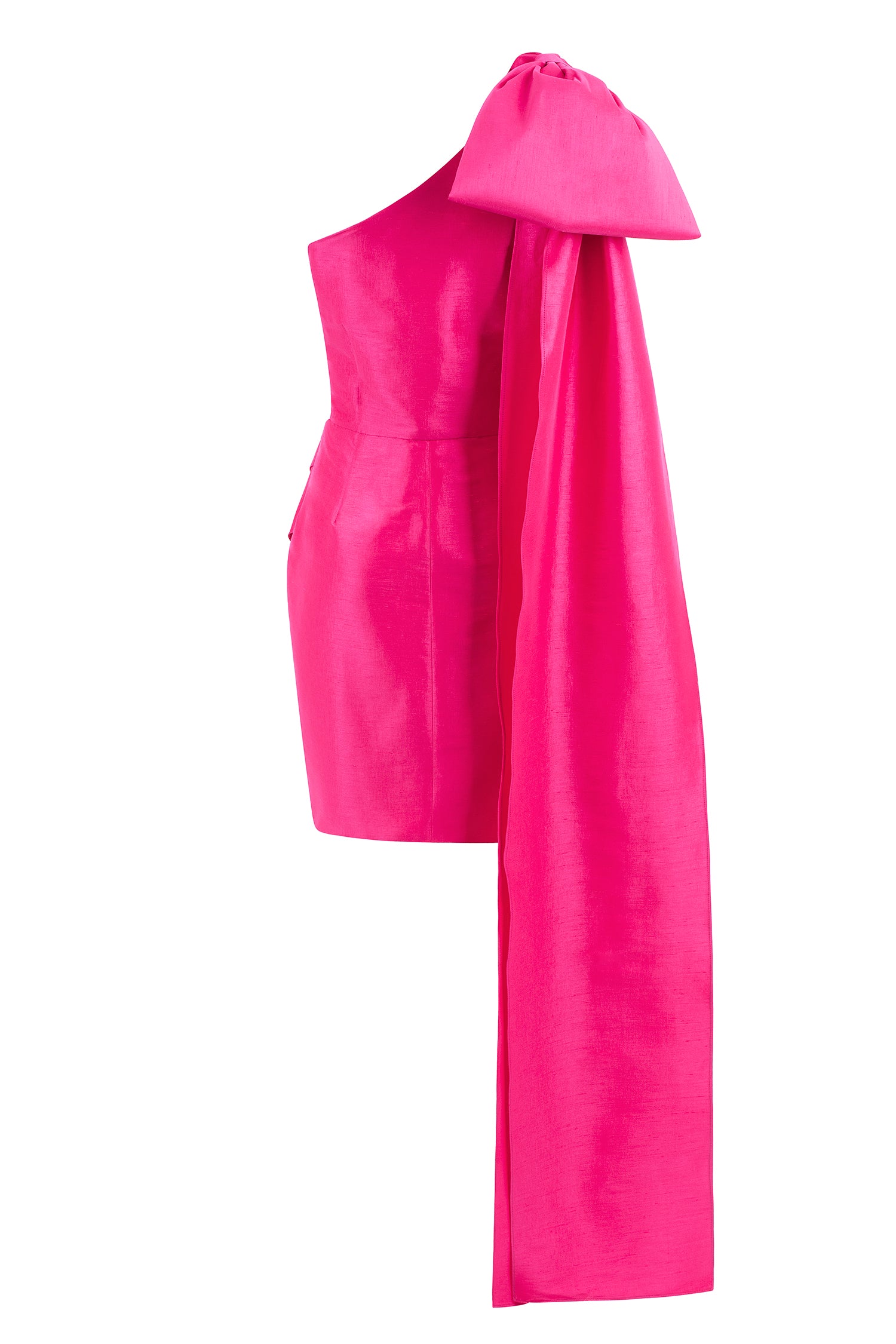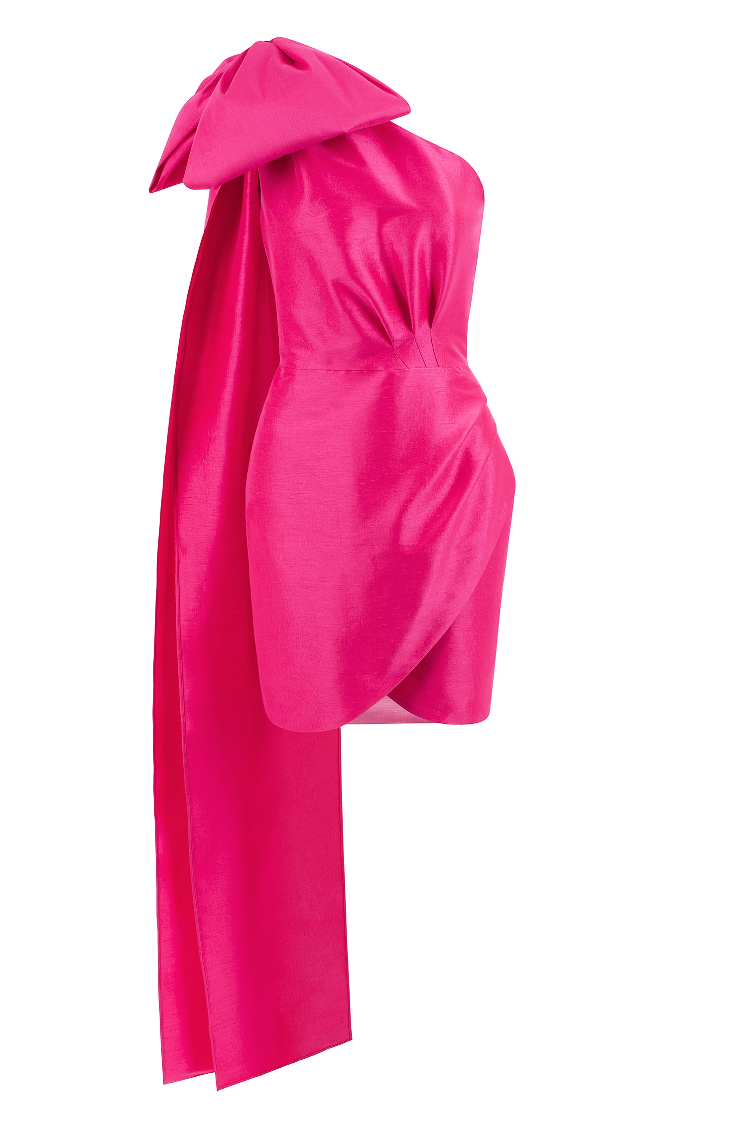 The striking contrast between the short-length dress and the dramatic oversized bow, which extends beyond the silhouette, creates an unforgettable visual impact.