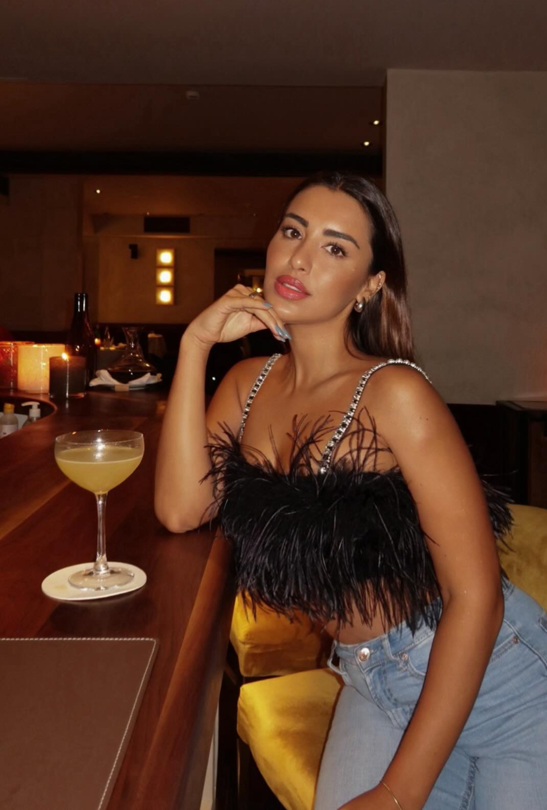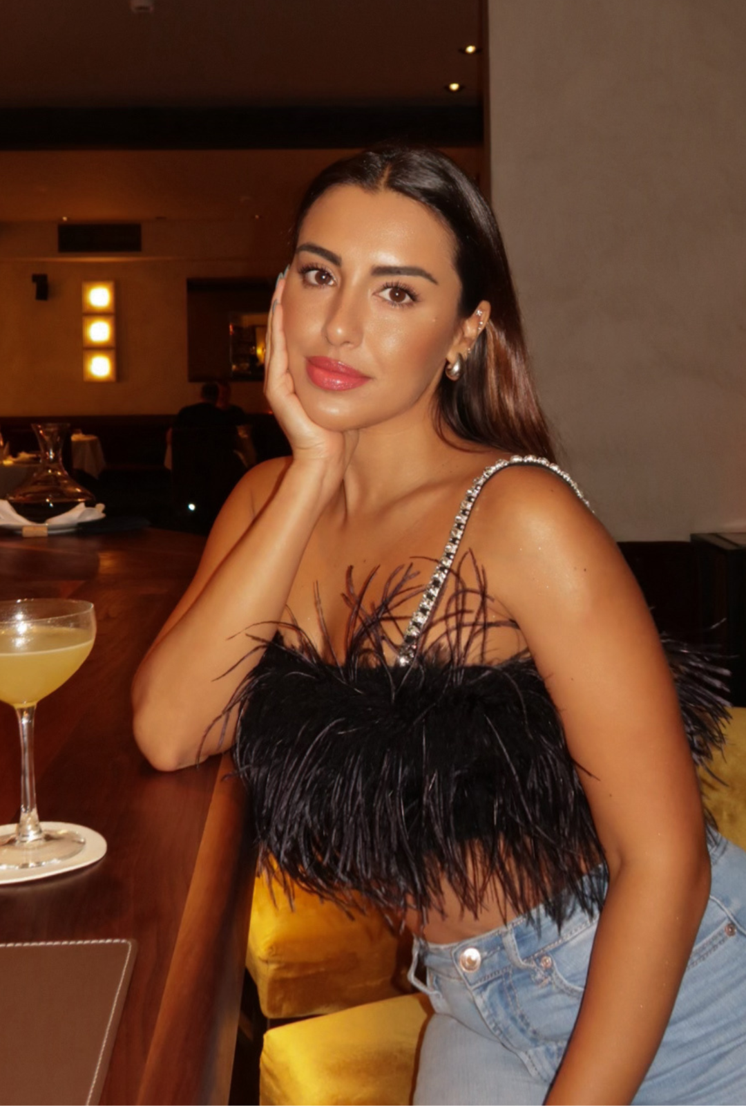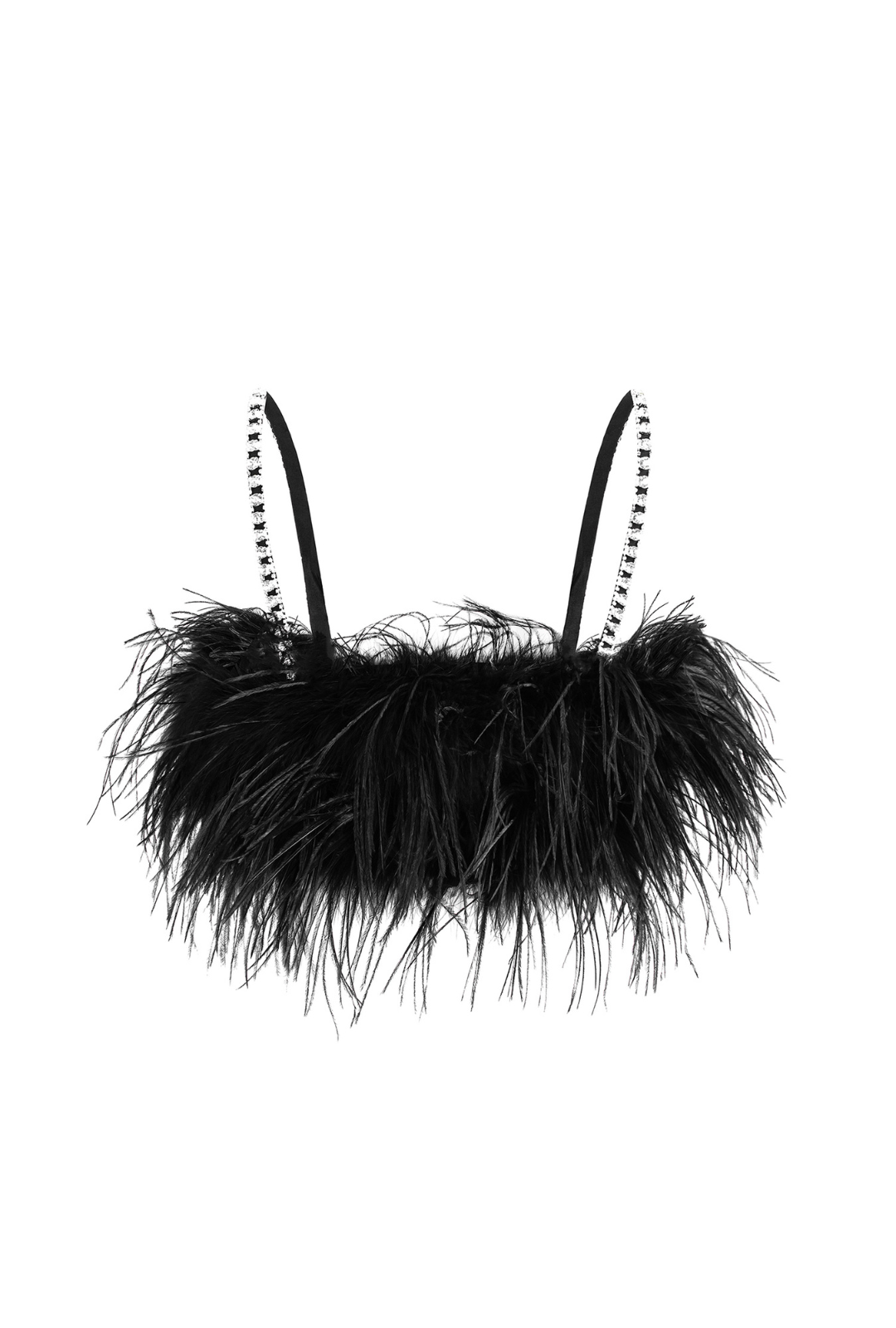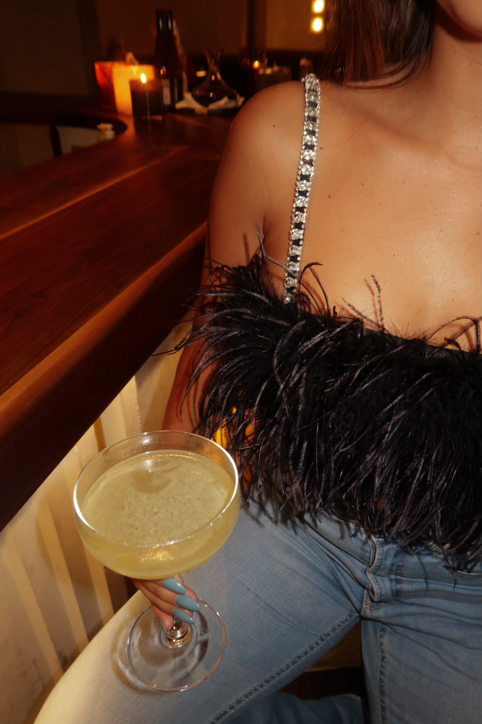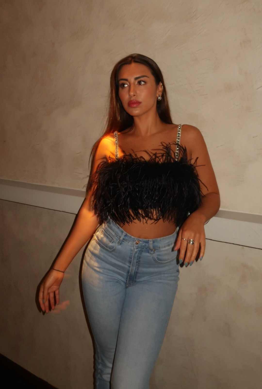 Crafted from structured satin fabric and fully lined with high-quality feathers, meticulously hand-sewn in designer Elsa Barreto’s atelier. Beyond the elegance of the feathers, this piece features delicate hand-stitched rhinestone straps. Fastens at the back with three fabric-covered buttons.