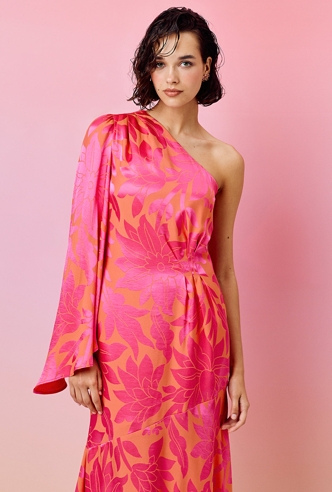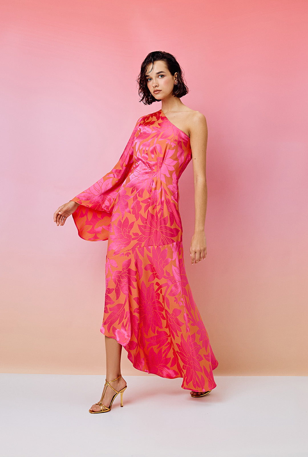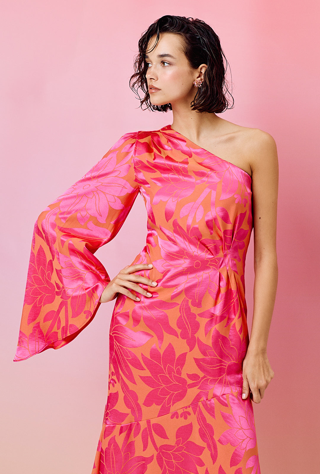 Designed to enhance the silhouette without compromising comfort, it offers an elegant aesthetic and graceful movement. The one-shoulder bell sleeve creates a harmonious balance with the flowing lower half of the dress.