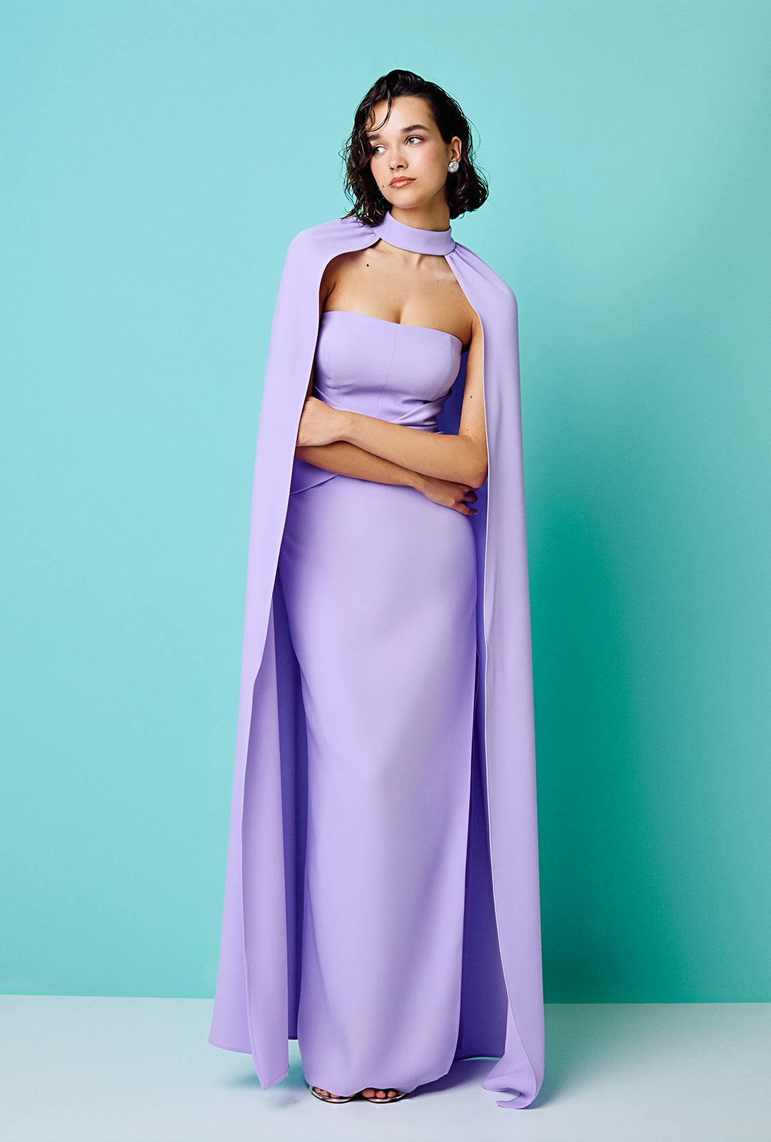 Strapless Crepe Long Dress with Knot Detail and Optional Cape