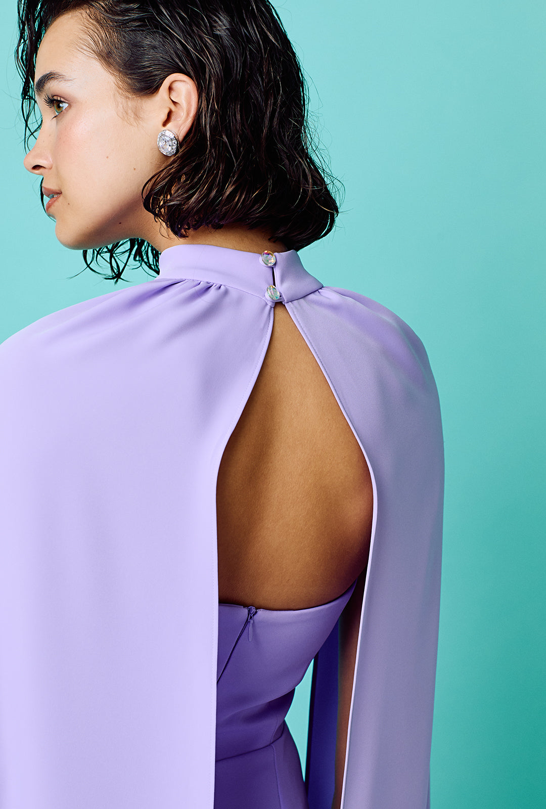 The invisible back zipper ensures a flawless and seamless fit. Additionally, this dress comes with a stunning detachable cape, fastening at the back of the neck with fabric-covered buttons. The cape adds a dramatic and glamorous touch, offering versatility—wear it for an elevated statement look, or remove it for a sleek and minimalist style.
