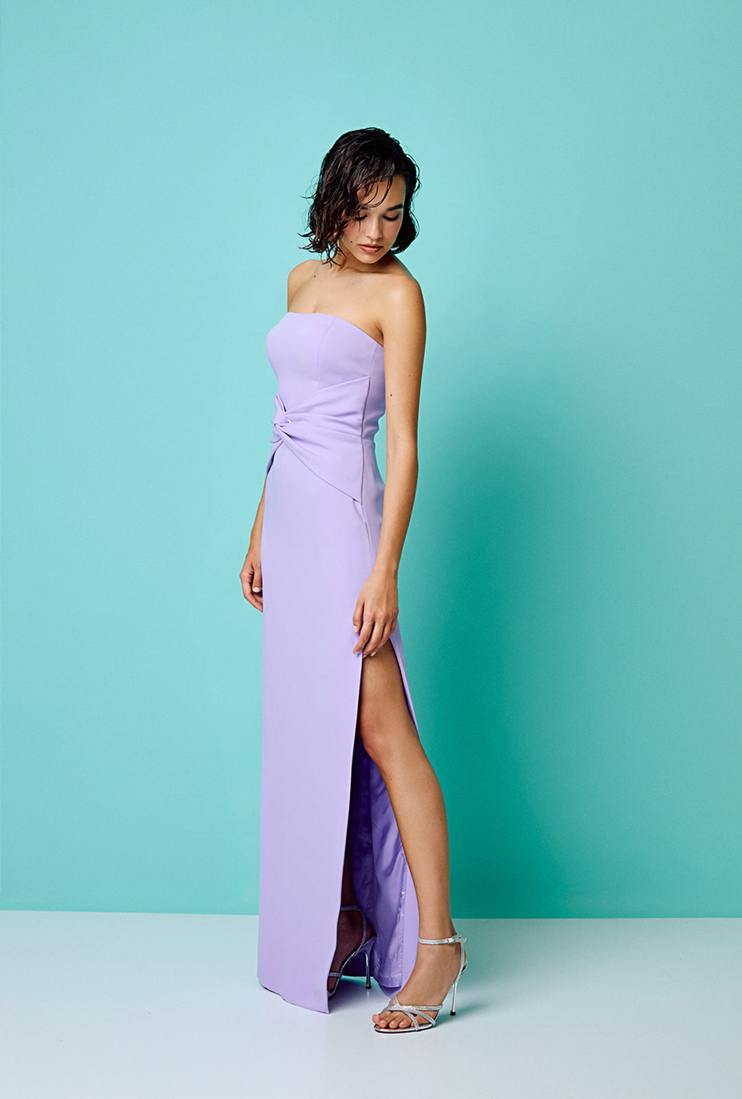 One of the standout features of this dress is the side slit, adding a touch of sensuality while allowing for ease of movement. The front knot detail creates a unique and eye-catching effect, while the bandeau neckline brings an element of sophistication to the design.