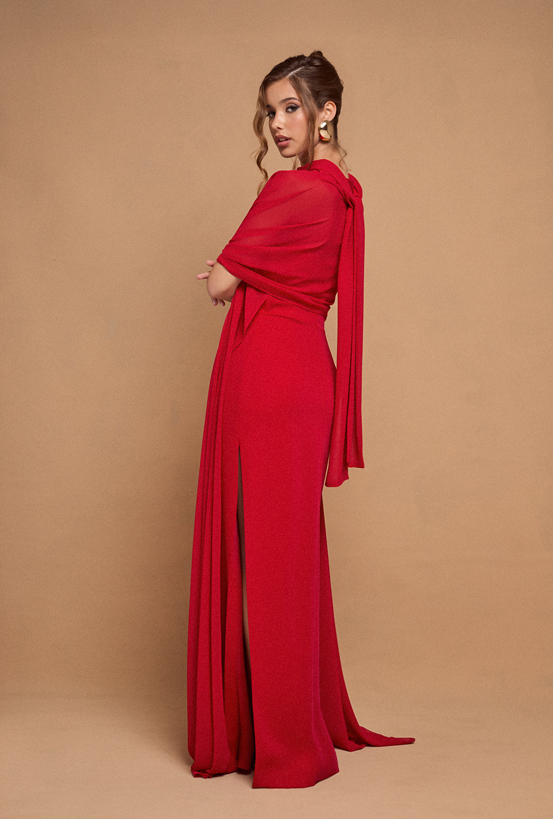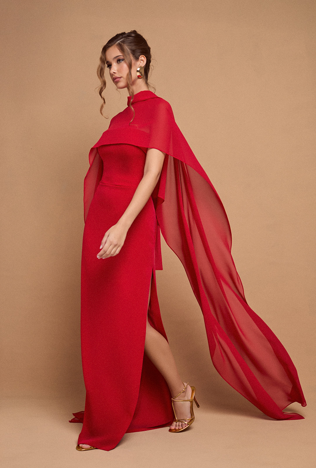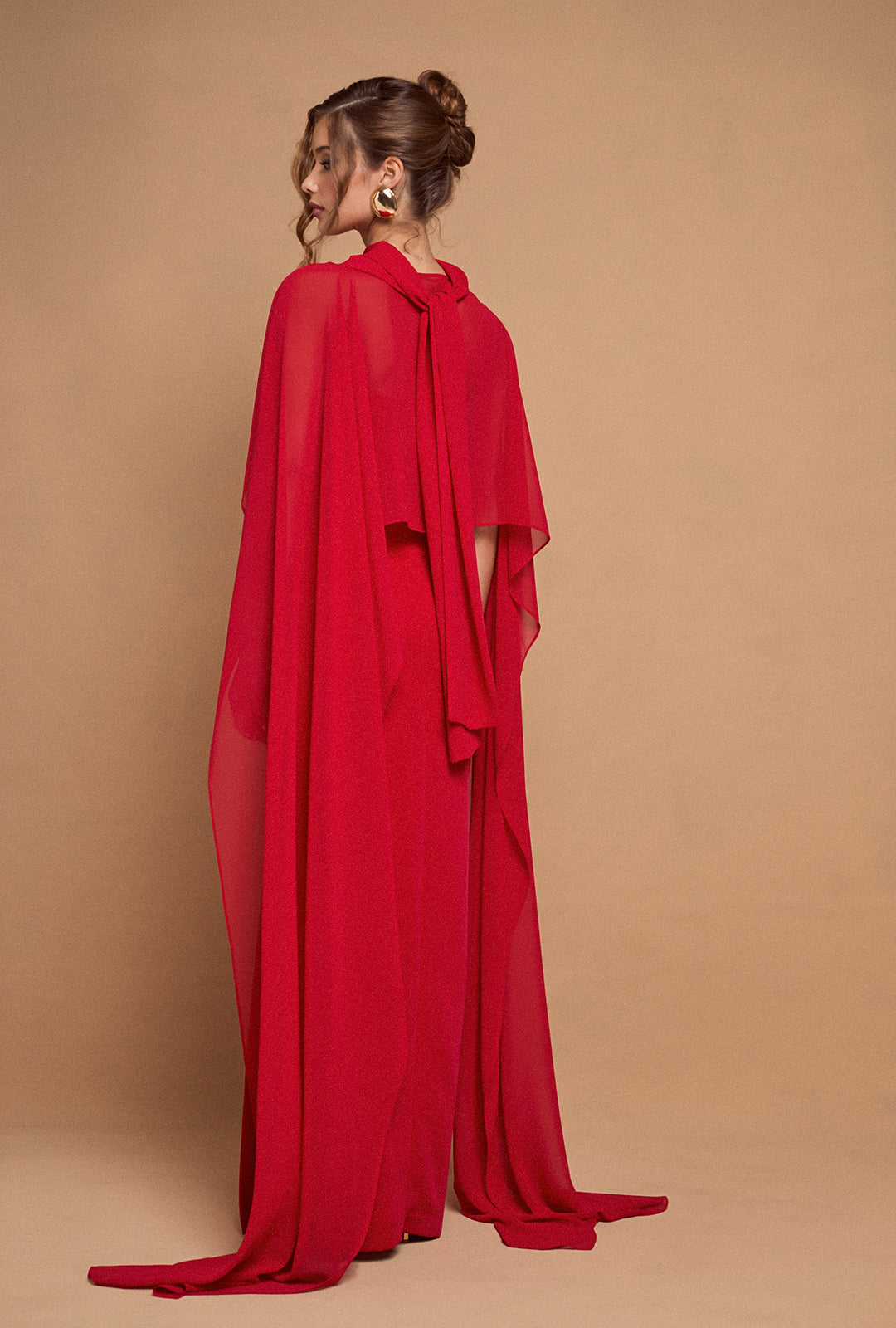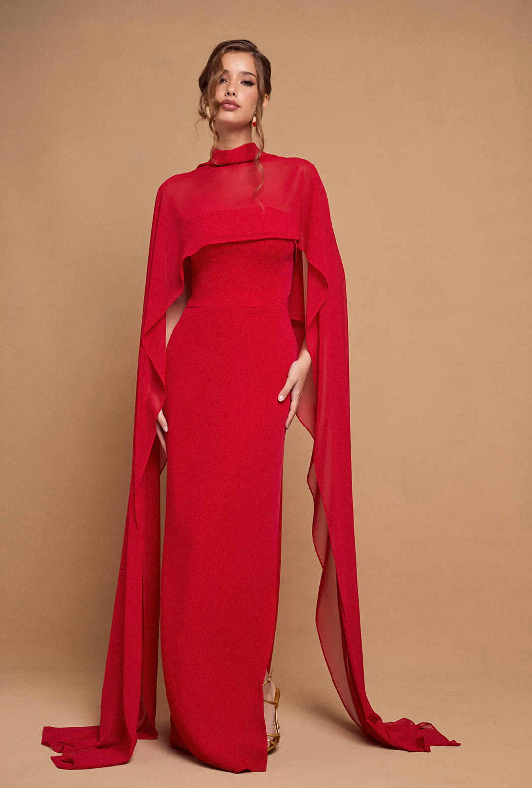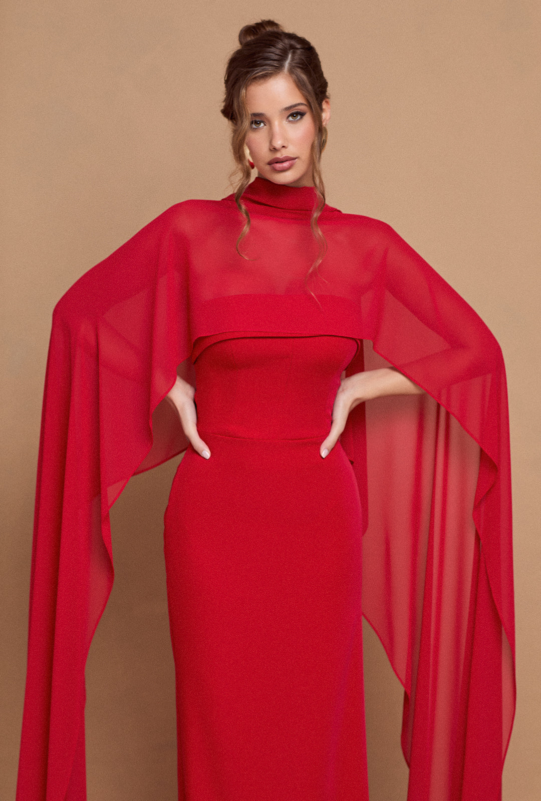 Crafted from high-quality crepe, it offers a flawless and comfortable finish. The removable cape, made from a lightweight, semi-transparent fabric, adds both function and grace—perfect for keeping warm without compromising the look.