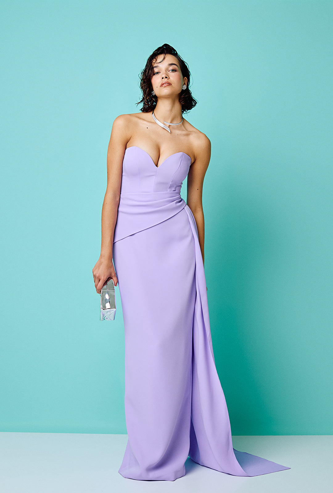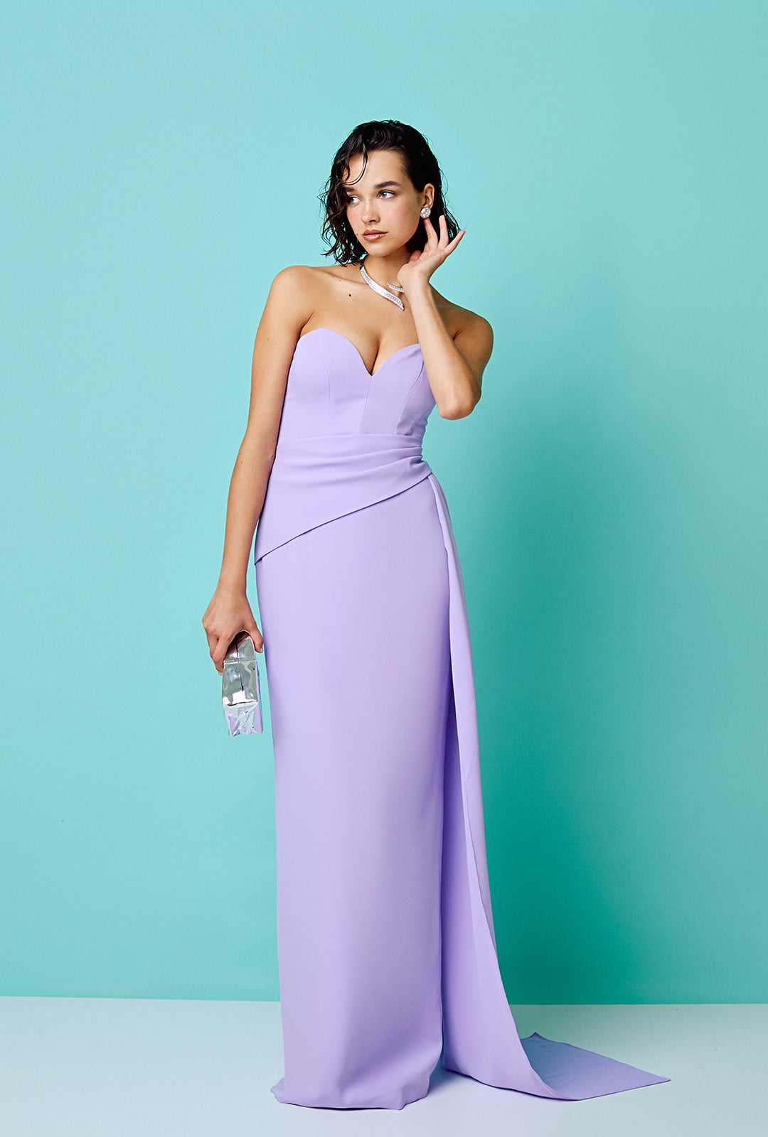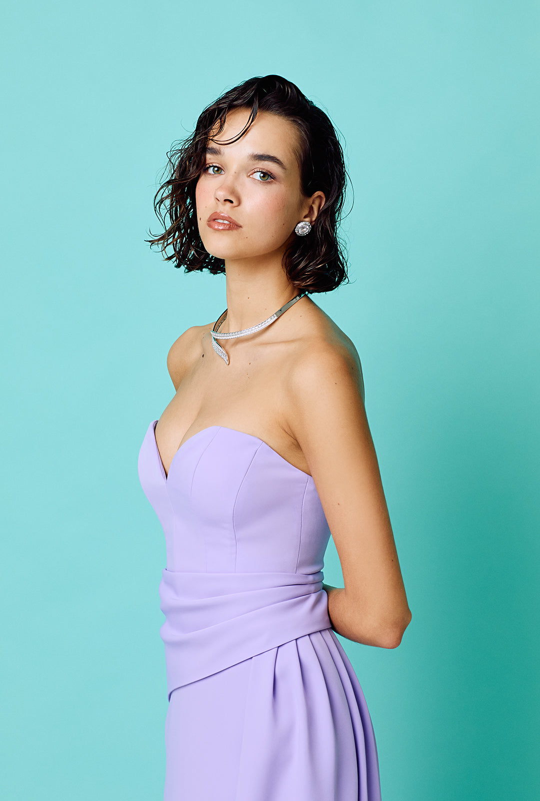 The form-fitting cut creates a corset-like effect thanks to internal boning and cups, providing exceptional support. The side tail, strategically positioned, adds drama and distinction, while the elegant draping at its origin enhances sophistication while offering comfort around the waist, ensuring ease throughout the evening.