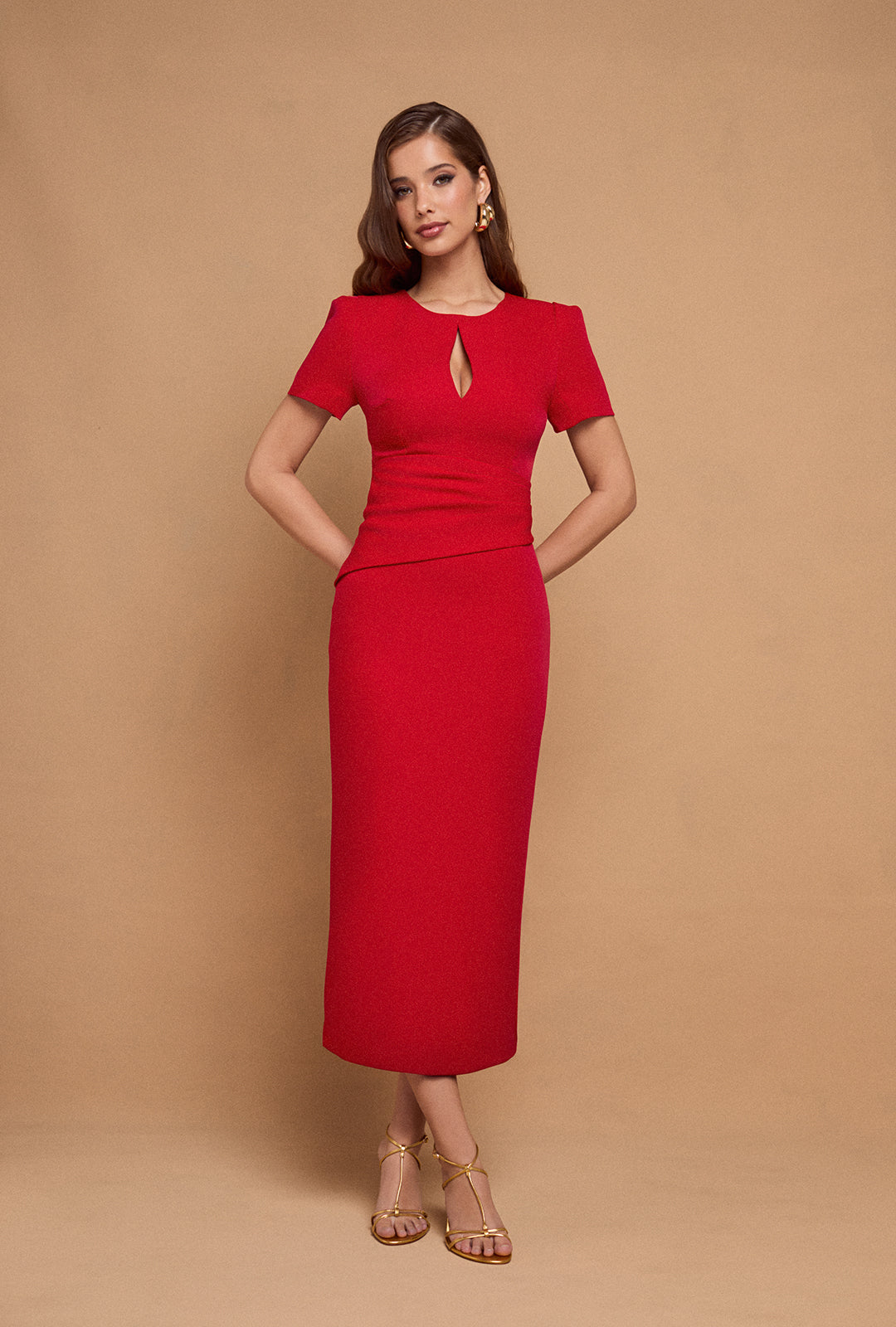 This crepe dress embodies modern elegance, designed to enhance and flatter the female silhouette with impeccable structure. Its short length and strategic design make it the perfect choice for events that call for sophistication with a bold touch.