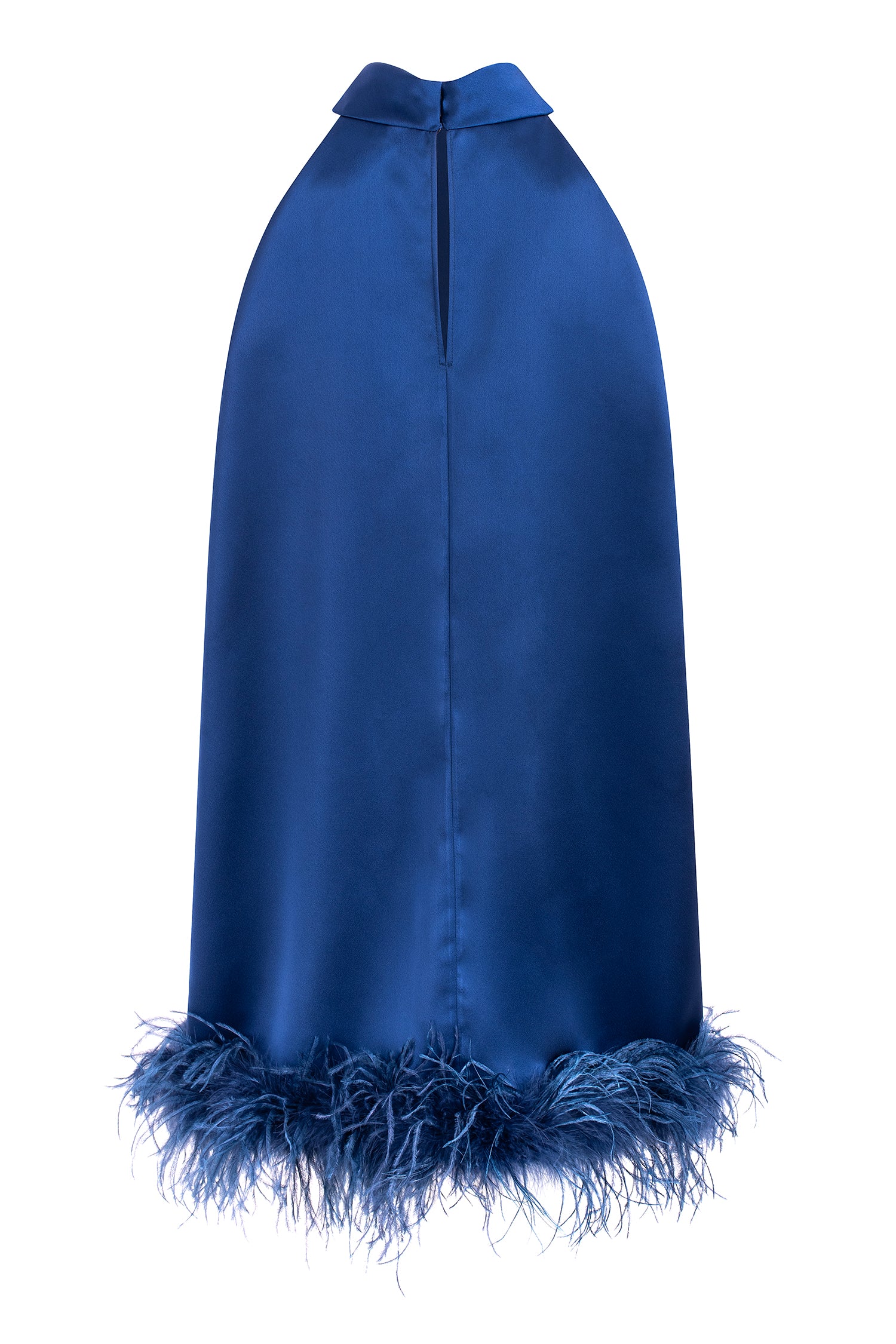 The highlight of the design is the feather trim at the hem, adding a touch of glamour and sophistication. Fastens at the back with a discreet button closure.