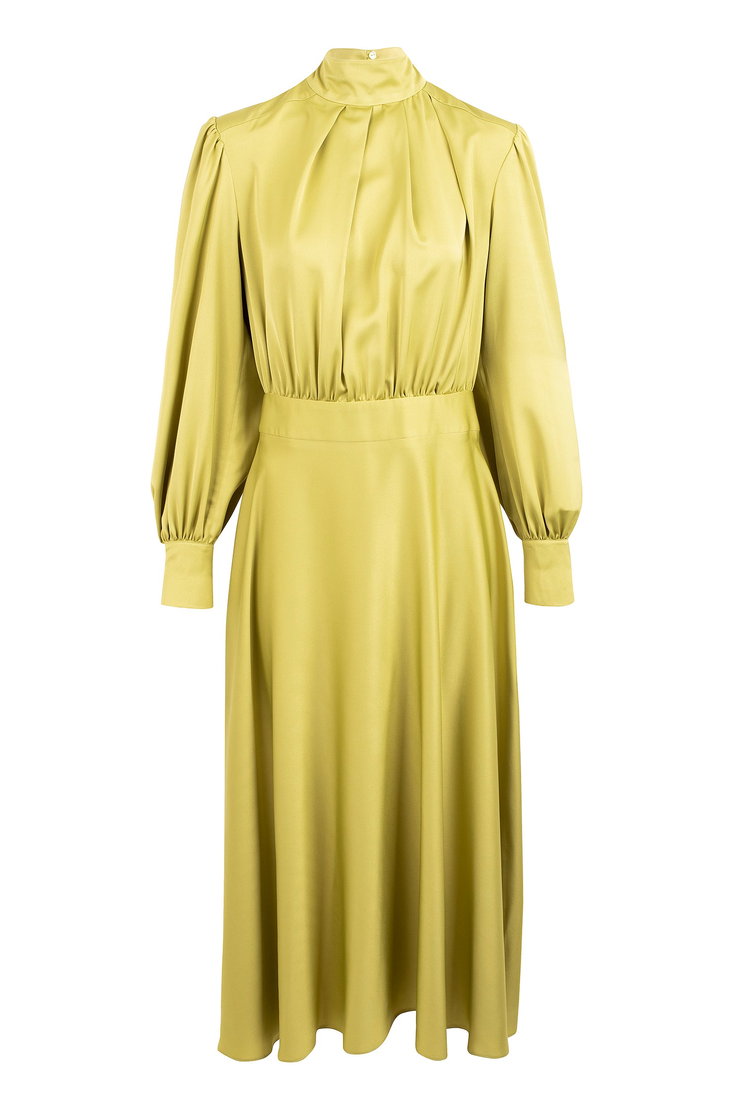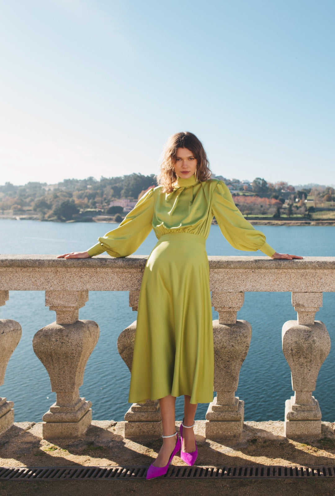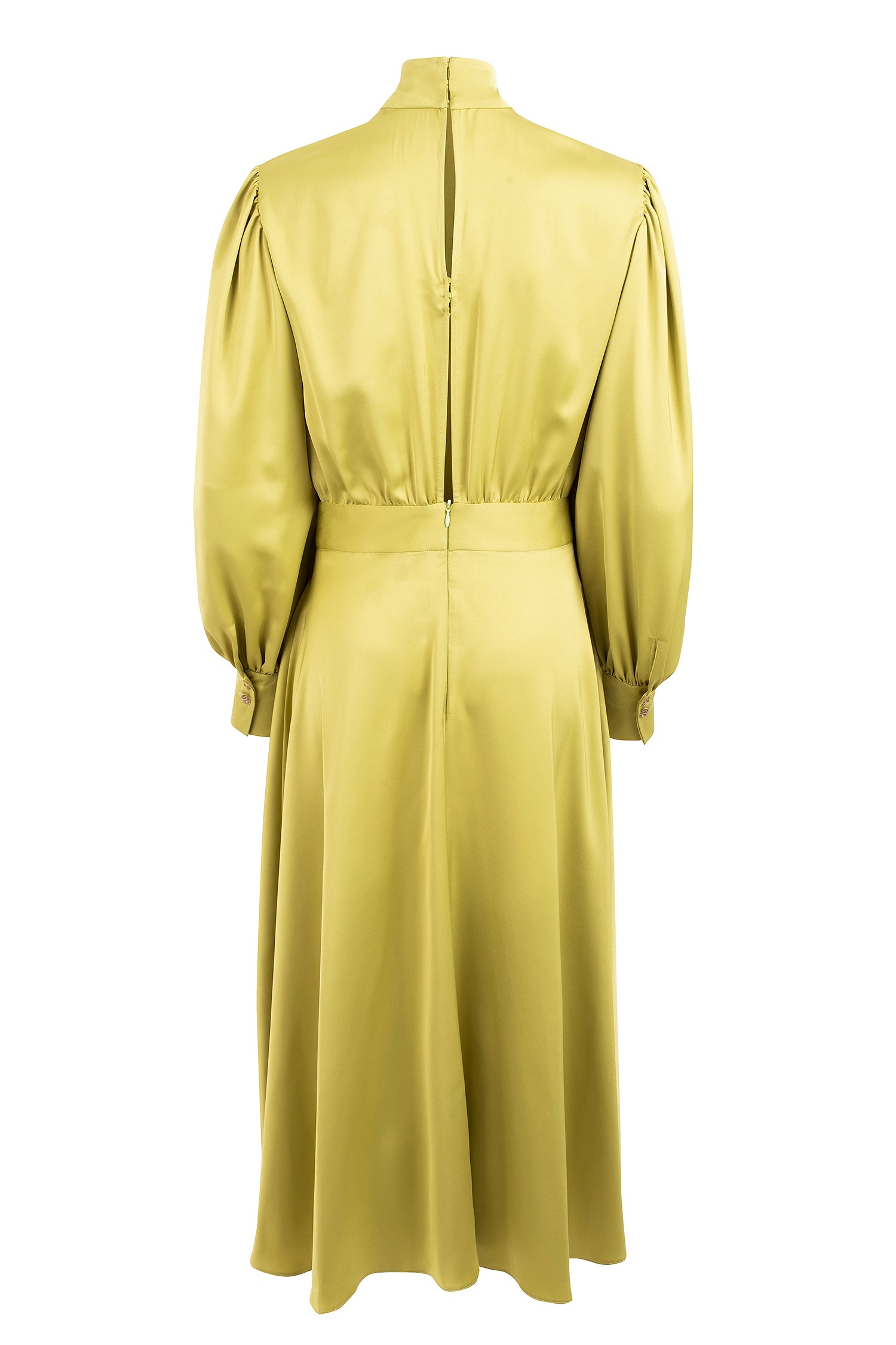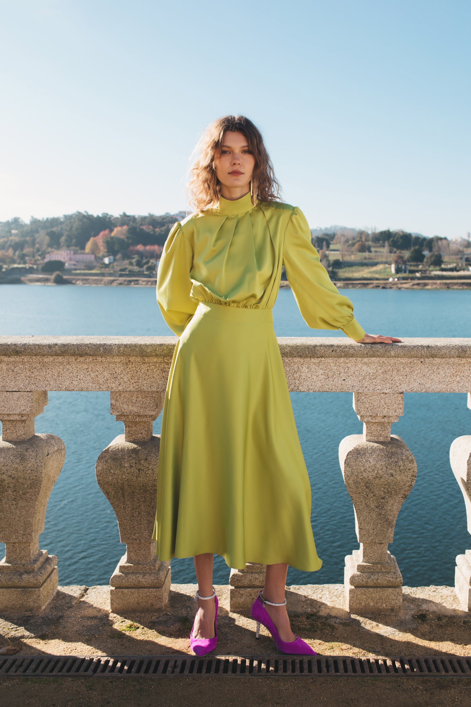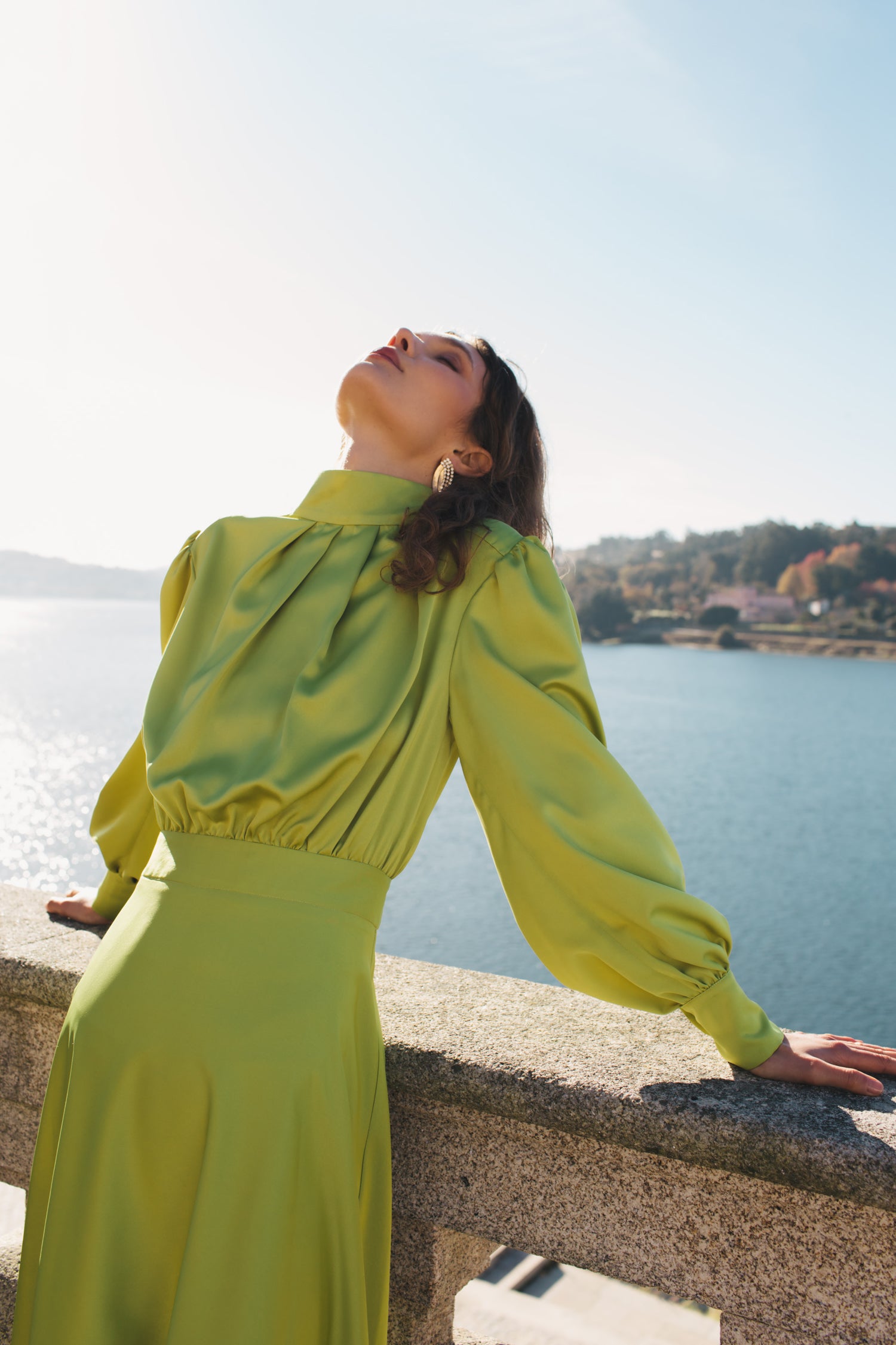 Este vestido apresenta um tecido acetinado, uma gola curta, pormenores drapeados no peito e mangas ligeiramente volumosas.