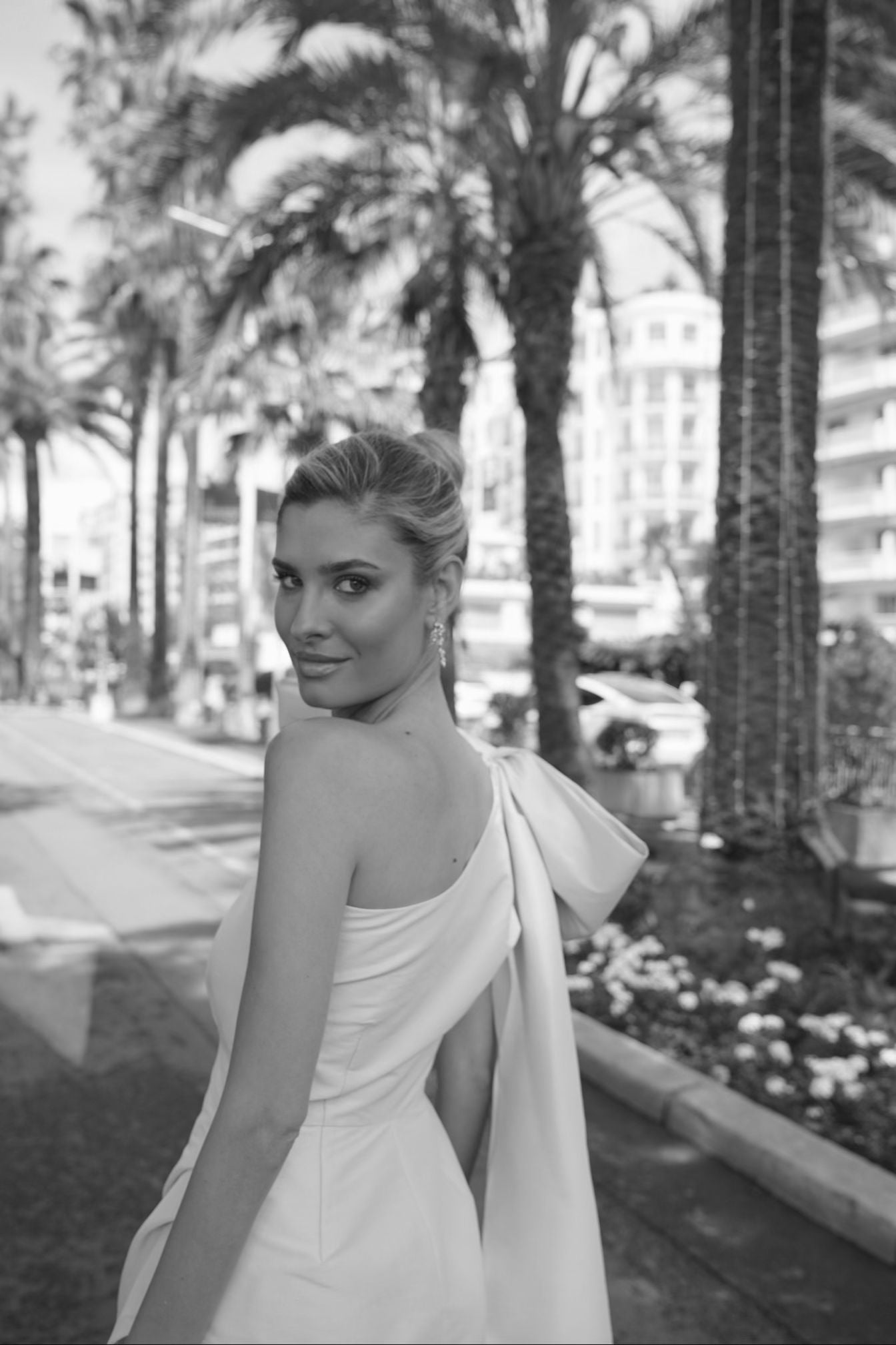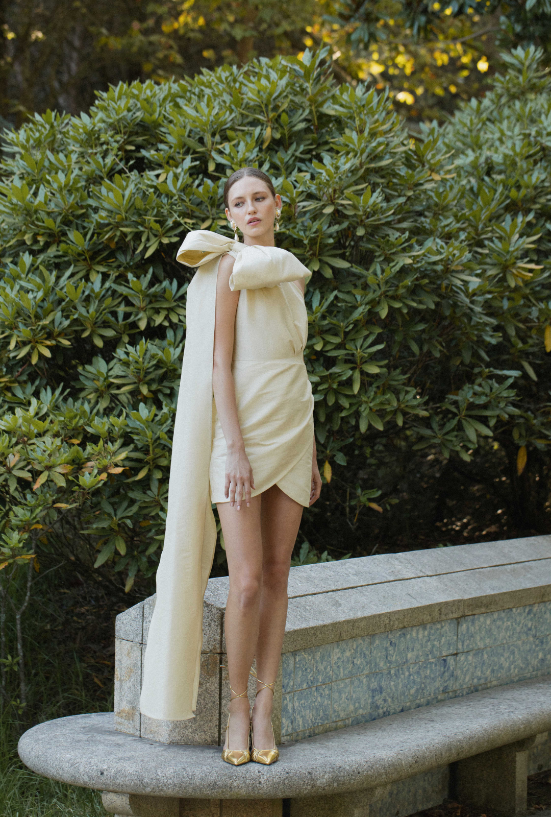 The striking contrast between the short-length dress and the dramatic oversized bow, which extends beyond the silhouette, creates an unforgettable visual impact.